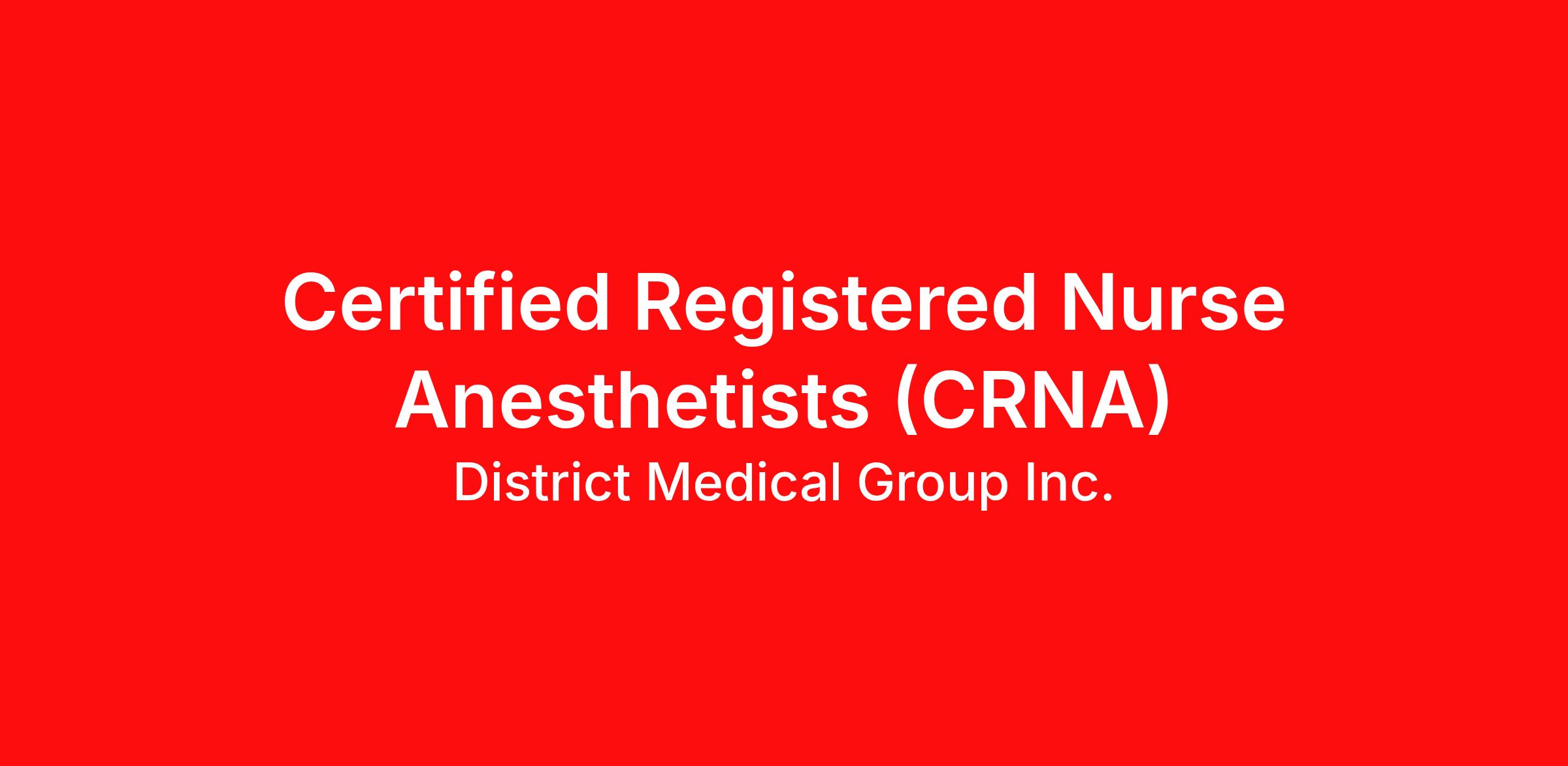 Certified Registered Nurse Anesthetists (CRNA) Phoenix , Arizona District Medical Group, Inc. (DMG), one of the largest multi-specialty physician groups in Phoenix, is actively seeking applications. As a CRNA with DMG, you would be exposed to a full scope of practice including regional blocks, pediatric anesthesia, burns, trauma and OB. Qualified candidates must be a graduate of a nurse anesthesia program accredited by the AANA Council on Accreditation of Nurse Anesthesia Programs. New graduates are welcome! Candidates must possess an AZ license prior to beginning employment. DMG offers a competitive comprehensive benefits package including CME allowance, paid time-off and employer paid malpractice insurance. To inquire about salary please reach out below. For consideration e-mail CV to practice@dmgaz.org EOE