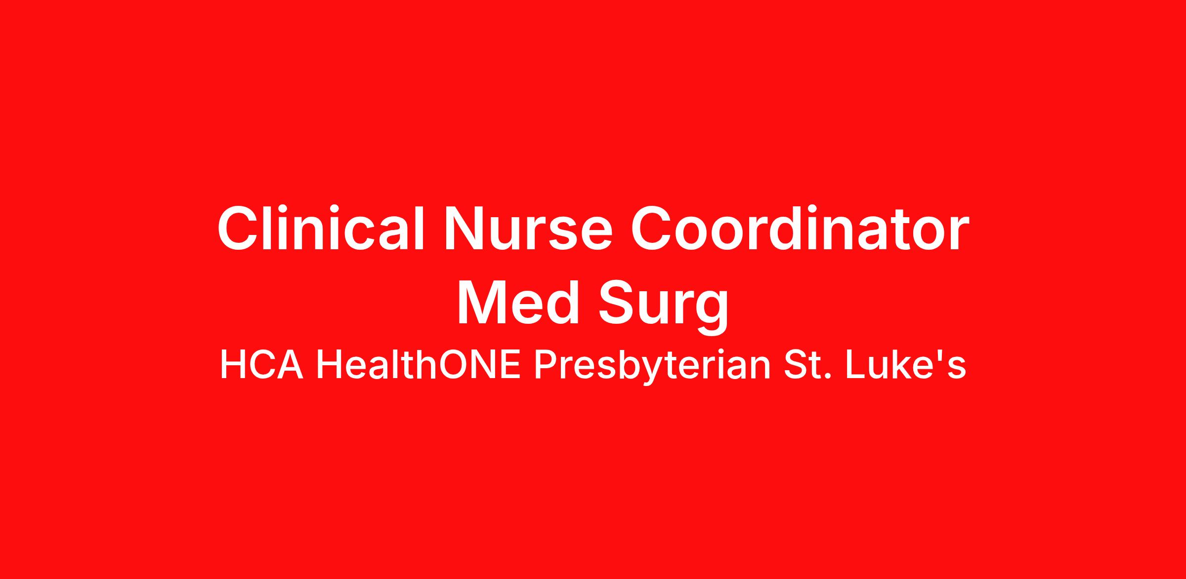 Hourly Wage Estimate: $40.15 - $58.58 / hour Learn more about the benefits offered for this job. The estimate displayed represents the typical wage range of candidates hired. Factors that may be used to determine your actual salary may include your specific skills, how many years of experience you have and comparison to other employees already in this role. The typical candidate is hired below midpoint of the range. Introduction Do you currently have an opportunity to make a real impact with your work? With over 2,000 sites of care and serving over 31.2 million patient interactions every year, nurses at HCA HealthONE Presbyterian St. Luke's have the opportunity to make a real impact. As a(an) Clinical Nurse Coordinator Med Surg you can be a part of change. Benefits HCA HealthONE Presbyterian St. Luke's, offers a total rewards package that supports the health, life, career and retirement of our colleagues. The available plans and programs include: Comprehensive medical coverage that covers many common services at no cost or for a low copay. Plans include prescription drug and behavioral health coverage as well as free telemedicine services and free AirMed medical transportation. Additional options for dental and vision benefits, life and disability coverage, flexible spending accounts, supplemental health protection plans (accident, critical illness, hospital indemnity), auto and home insurance, identity theft protection, legal counseling, long-term care coverage, moving assistance, pet insurance and more. Free counseling services and resources for emotional, physical and financial wellbeing 401(k) Plan with a 100% match on 3% to 9% of pay (based on years of service) Employee Stock Purchase Plan with 10% off HCA Healthcare stock Family support through fertility and family building benefits with Progyny and adoption assistance. Referral services for child, elder and pet care, home and auto repair, event planning and more Consumer discounts through Abenity and Consumer Discounts Retirement readiness, rollover assistance services and preferred banking partnerships Education assistance (tuition, student loan, certification support, dependent scholarships) Colleague recognition program Time Away From Work Program (paid time off, paid family leave, long- and short-term disability coverage and leaves of absence) Employee Health Assistance Fund that offers free employee-only coverage to full-time and part-time colleagues based on income. Learn more about Employee Benefits Note: Eligibility for benefits may vary by location. It is an exciting time to be a nurse at HCA Healthcare! Come unlock your career potential and see how rewarding it can be to reach your personal and professional goals. Help to advance the practice of nursing and improve positive outcomes for your patients as a (an) Clinical Nurse Coordinator Med Surg. We want your knowledge and expertise! Job Summary and Qualifications The Clinical Nurse Coordinator (CNC) ensures and delivers high quality, patient-centered care and coordination of all functions in the unit/department during the designated shift. In collaboration with other members of the management team, the CNC directs, monitors, and evaluates nursing care in accordance with established policies/procedures, serves as a resource person for staff, and models a commitment to the organization’s vision/mission/values to support an unparalleled patient experience and clinical outcomes that contribute to overall departmental performance. What you will do in this role: Assists with admission and discharge processes to ensure efficient throughput and high quality, patient-centered care. Participates in the ongoing assessment of the quality of patient care services provided in the unit, in collaboration with other members of the management team. Collaborates with subject matter experts and other managers to create an environment of teamwork that supports improved outcomes and service. Supports a patient-first philosophy and engages in service recovery when necessary. Supports the efforts of the facility to improve engagement by operationalizing current nursing strategies, including employee rounding, hourly rounds, and other initiatives. Provides recommendations related to interviewing, selecting, and training new staff. Recommends and implements courses of action, including training and development, conflict resolution, personnel policy compliance, completion of performance evaluations, and/or disciplinary actions to ensure a competitively better organization. Assists with staff scheduling. Manages all practical aspects of staff labor in accordance with patient care needs and established productivity guidelines. Supports proper inventory control and assists with managing supplies and equipment. What qualifications you will need: Basic Cardiac Life Support must be obtained within 30 days of employment start date (RN) Registered Nurse Registered Nurse Diploma HCA HealthONE, one of the largest and most comprehensive healthcare systems in the Rocky Mountain region, offers more than 170 care sites in the Denver metro area. Offering services across the continuum of care to meet patients’ total healthcare needs, HCA HealthONE includes seven acute care hospitals, a dedicated flagship pediatric hospital, a rehabilitation hospital, CareNow® urgent care clinics, mental health campuses, imaging and surgery centers, physician practices, home and hospice care, and AirLife Denver, which provides regional critical care air and ground transportation. Among HCA HealthONE’s acute care hospitals is Presbyterian/St. Luke’s (P/SL). P/SL has been meeting the healthcare needs of patients and their families from across the Rocky Mountain region for more than 140 years. Included on the P/SL campus is Rocky Mountain Children’s, a dedicated pediatric hospital, making the campus the only tertiary/quaternary combined pediatric and adult hospital in this region. P/SL is home to an award-winning cancer p