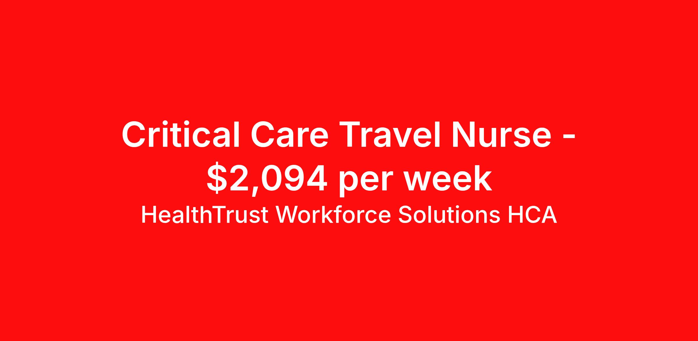 HealthTrust Workforce Solutions HCA is seeking a travel nurse RN ICU - Intensive Care Unit for a travel nursing job in Kansas City, Missouri. Job Description & Requirements Specialty: ICU - Intensive Care Unit Discipline: RN Duration: 13 weeks 36 hours per week Shift: 12 hours, nights Employment Type: Travel Entrust Your Career to HealthTrust! At HealthTrust, we believe that healthcare is not defined by the four walls in which it is practiced; it’s defined by its people. We pride ourselves on crafting opportunities that expand skill sets, broaden career horizons, provide economic stability, and cultivate personal growth. HealthTrust Offers: Competitive Pay Packages Guaranteed hours Weekly direct deposit options 401k with Company Match Earn up to $750 for referrals Free Private Furnished Housing or Tax-Free Subsidy To get started, you will need: RN's a minimum of 1 year in specialty Allied 6 months of experience An adventurous spirit and fierce dedication Degree in corresponding specialty as required Appropriate certifications and licensure as needed for the specific position HealthTrust Benefits: Opportunities for a lifetime: When you become a part of the HCA family, you will have exclusive access to more opportunities than any other healthcare system in the nation. At HWS, we help open the door to a lifetime of lasting career opportunities. A culture of care: Our clinicians have made HWS an industry leader for over 25 years. We are passionate about our mission that, above all else, we are committed to the care and improvement of human life. Career Development: As a wholly owned subsidiary of HCA Healthcare, HWS is a preferred partner to thousands of top-performing hospitals. We provide our healthcare professionals with first-priority access to more than 200,000 jobs nationwide. We are uniquely positioned to offer you exclusive and direct access to HCA Healthcare’s vast network of facilities. Let us open the door to nationwide opportunities that fit your lifestyle! We are an equal opportunity employer and value diversity at our company. We do not discriminate on the basis of race, religion, color, national origin, gender, sexual orientation, age, marital status, veteran status, or disability status. Job Requirements Certifications ACLS (Required) NIHSS (Required) BLS (Required) HealthTrust Workforce Solutions HCA Job ID 870472. Posted job title: Travel Nurse - Critical Care About HealthTrust Workforce Solutions HCA At HealthTrust Workforce Solutions, healthcare is not just about the four walls of a facility but about the people who provide and receive care. Our focus is on empowering healthcare professionals to deliver exceptional patient experiences by providing them with the necessary skills, tools, and support. We partner with healthcare facilities nationwide to ensure that the right professionals are in the right roles. We prioritize our clinicians by giving them a voice and access to opportunities to fulfill their mission of improving lives by providing quality patient care. We are committed to our core values of Trust, Innovation, Adaptability, Courage, and Accountability. We are dedicated to positively impacting the healthcare industry by providing first-priority access to more than 200,000 jobs nationwide to our healthcare professionals. Join us and be part of the HealthTrust family, where you can make a difference every day. We embrace our changing environment, and we maintain a culture that has a rich tradition of transforming itself to meet the challenges of the future. MISSION STATEMENT While putting great people in the right roles is essential, our mission is far greater. We want our clinicians to be part of the HealthTrust family, where healthcare professionals have a voice and are empowered with the right tools and opportunities to fulfill their personal mission of improving lives. Plus, as a preferred partner to thousands of top-performing hospitals, we provide our healthcare professionals with first-priority access to more than 200,000 jobs nationwide. Benefits Dental benefits Vision benefits Referral bonus Continuing Education Life insurance