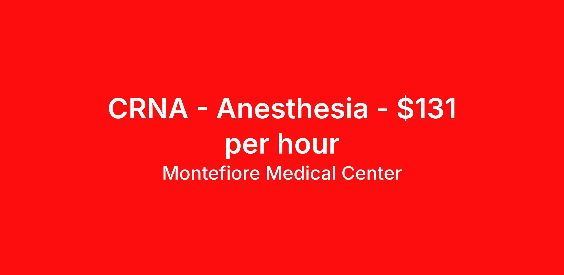 Montefiore Medical Center is seeking a CRNA Anesthesia for a job in Bronx, New York. Job Description & Requirements Specialty: Anesthesia Discipline: CRNA Start Date: ASAP Duration: Ongoing Employment Type: Staff City/State: Bronx, New York Grant Funded: No Department: Department Of Anesthesiology Bargaining Unit: NYSNA Work Shift: Day Work Days: MON-FRI Scheduled Hours: 7:30 AM-5:30 PM Scheduled Daily Hours: 10.5 HOURS Hourly Rate: $131.28 For positions that have only a rate listed, the displayed rate is the hiring rate but could be subject to change based on shift differential, experience, education or other relevant factors. To learn more about the “Montefiore Difference” – who we are at Montefiore and all that we have to offer our associates, please click here. Job Summary: As a CRNA you will provide General and Regional Anesthesia services to patients under the supervision of an attending anesthesiologist. Provides Preoperative Anesthesia Services in Preanesthesia Assessment Center in collaboration with attending anesthesiologist. Prepares all necessary equipment and medications for perioperative anesthetic management. New York City is a wonderful place to learn and practice medicine. Job Requirements: Master’s degree from an accredited Program on Nurse Anesthesia, as recognized by the Council on Accreditation of Nurse Anesthesia Educational Programs (COA). Certification by the National Board of Certified Registered Nurse Anesthetists (NBCRNA)- Certification required biannually. Basic Life Support (BLS) and Advanced Cardiac Life Support (ACLS) Certifications - certification biannually. Benefits Package: CRNA Associates enjoy access to career training and advancement opportunities, and are rewarded with competitive compensation and a comprehensive benefits package, which includes: NYSNA Union Benefits Experience differential (additional compensation for years of experience as a RN and CRNA) Education differential (additional compensation for Masters or Doctorate degree) Paid time off including vacation days, sick days and holidays Medical, dental & vision insurance; low to zero cost prescription benefits Maternity and Paternity Leave Retirement benefits including Hospital sponsored NYSNA Pension at zero cost to CRNA. Optional 403b plan through Fidelity. Flexible spending accounts Life insurance Disability benefits 100% Tuition Reimbursement A highly desirable schedule including no weekends, no holidays, no call and no nights. Discounted employee parking Team Member purchase discounts Opportunity to teach and mentor CRNAs Montefiore Medical Center is an equal employment opportunity employer. Montefiore Medical Center will recruit, hire, train, transfer, promote, layoff and discharge associates in all job classifications without regard to their race, color, religion, creed, national origin, alienage or citizenship status, age, gender, actual or presumed disability, history of disability, sexual orientation, gender identity, gender expression, genetic predisposition or carrier status, pregnancy, military status, marital status, or partnership status, or any other characteristic protected by law. Montefiore Medical Center Job ID JR227746. Posted job title: REGISTERED CRNA About Montefiore Medical Center Montefiore, the University Hospital for Albert Einstein College of Medicine, is one of nation's largest academic medical centers. Those who work here are driven by a passion to serve and a desire to provide excellent care to all. We are a growing organization and one of New York’s top employers. Join us as we further our reputation as a leader in clinical care, healthcare research, education and social commitment.