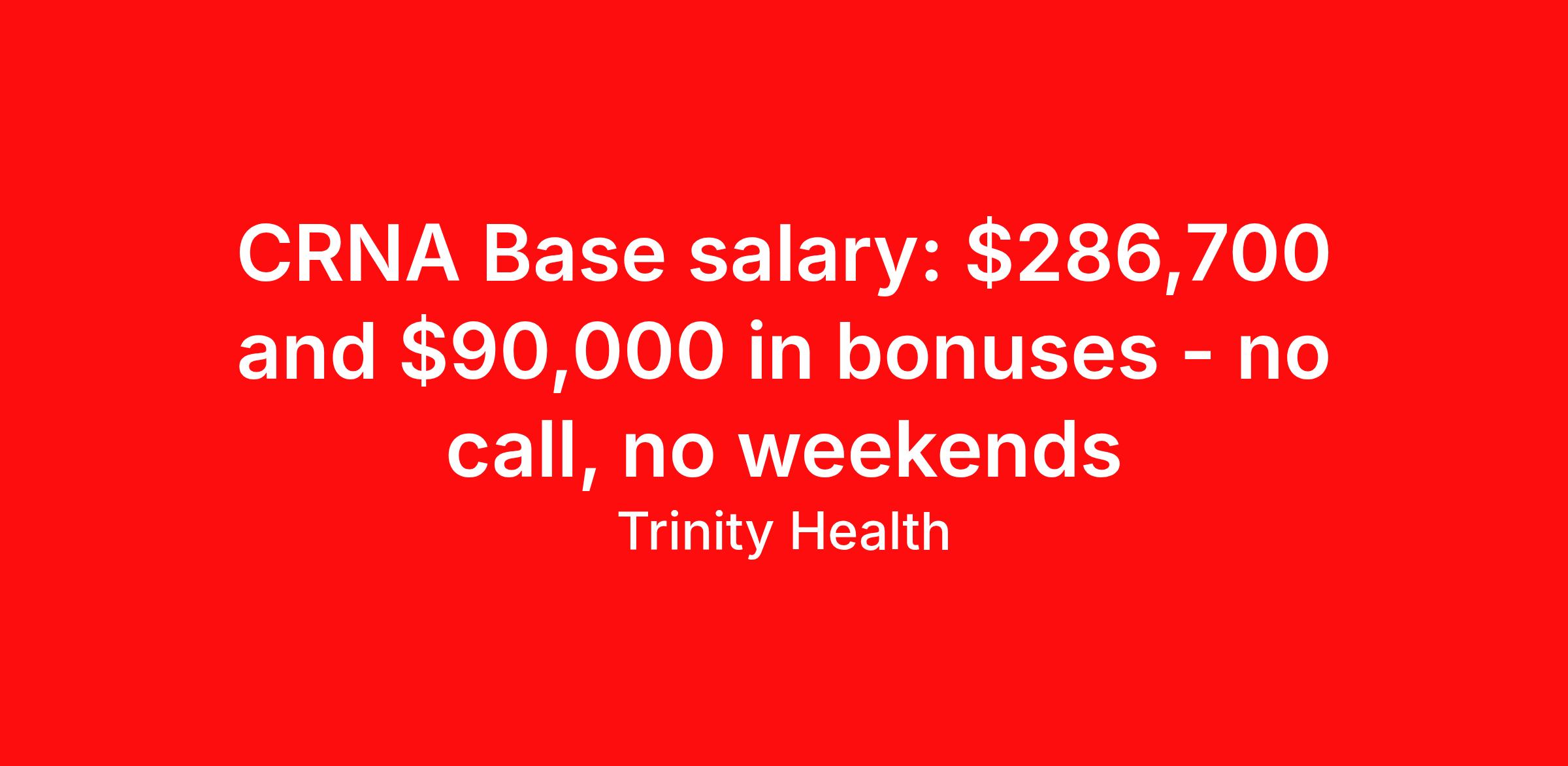 CRNA Base salary: $286,700 and $90,000 in bonuses - no call, no weekends