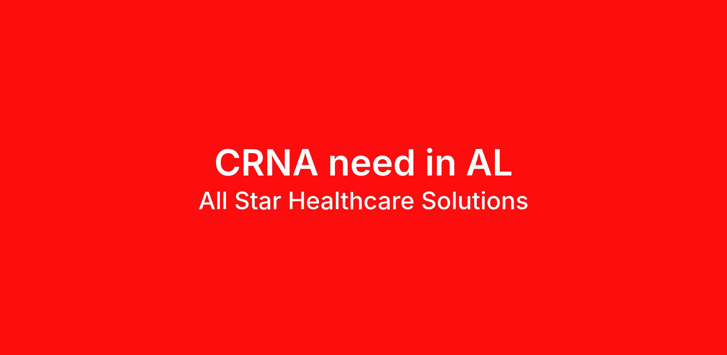 All Star Healthcare Solutions is seeking a CRNA to assist with locums coverage in Alabama. Job details include: Must be AL licensed Minimum of 1-2 weeks/month ongoing, starting February 8's and 10's Cases: orthopedics, endoscopy, vascular, general, spine, radiology, cardiac, urology, ophthalmology, OB/GYN (OB is not required), ENT, neuro and thoracic. Comfort with guided ultrasound blocks and epidurals is preferred. No OB. No Call Active AL license required All Star Healthcare Solutions benefits Full-service agency 24/7 professional and reliable service Dedicated, specialty-specific consultants Competitive pay Malpractice coverage Paid and coordinated travel services Member of NALTO