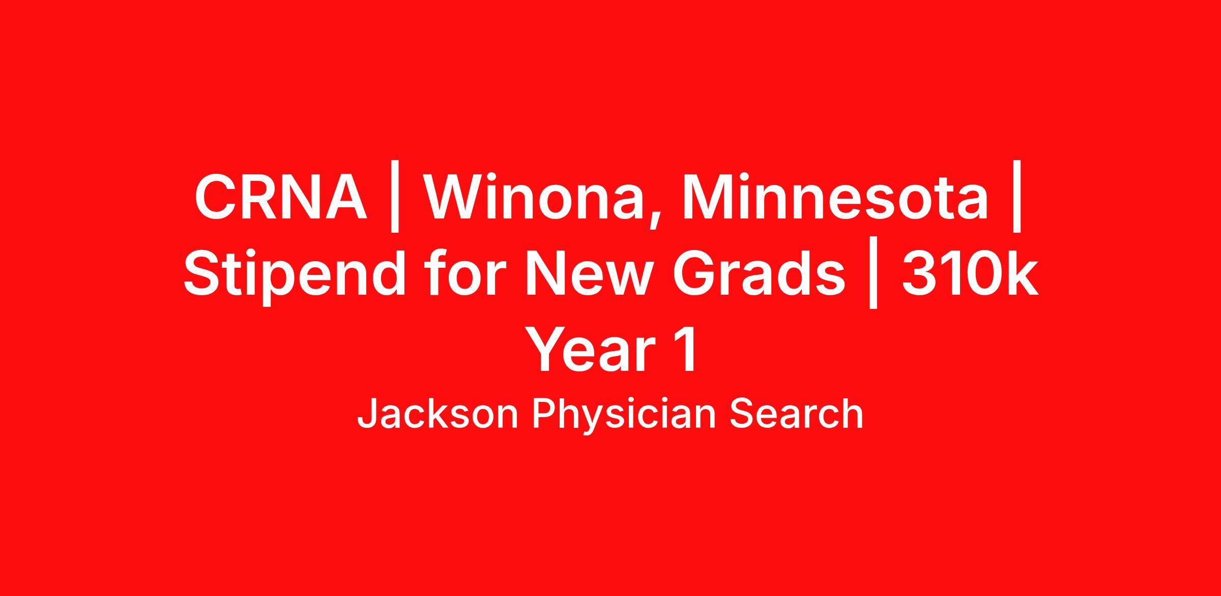 Winona Health, an independent, community-owned, not-for-profit healthcare provider seeks exceptional CRNA for a tremendous growth opportunity. Your career will thrive here! - Work / Life Balance: 3 days per week on campusblock schedule option considered - Tiered Release: head home when your cases wrap up and still get paid - Negligible Callbacks: rarely get called in for much except c-sectionsthere were 2 in the last 6 months! - Generous Base Salary: plus your regular schedule is so light and call is so easy, you can boost your income by picking up extra shifts at $1400/shift - Interesting Variety of Cases: from general surgery to OBGyn to urologyand a higher acuity than you would find at a surgery center - W2 or 1099 option for interested candidates WINONA, MINNESOTA Located on the Mississippi River and just a short drive to La Crosse, WI and Rochester, MN, this southeastern city is located in one of the warmest parts of the state and situated on one of the most beautiful lakes in Minnesota. - Affordable housing market. Many providers also live in or near Rochester or LaCrosse. - Excellent school systems both public and private - Home to three universities, there is a collegiate atmosphere and youthful vibe to the community. - Endless outdoor activities include hunting, fishing, kayaking, cross country skiing, hiking, biking, 3 golf courses, snowshoeing, ice climbing and more! Contact Susan Anderson: Call or Text: 636-237-6263 Email: susan.anderson@jacksonphysiciansearch.com Schedule a Call: https://calendly.com/sanderson Specialty: Crna Employment Type: Full Time