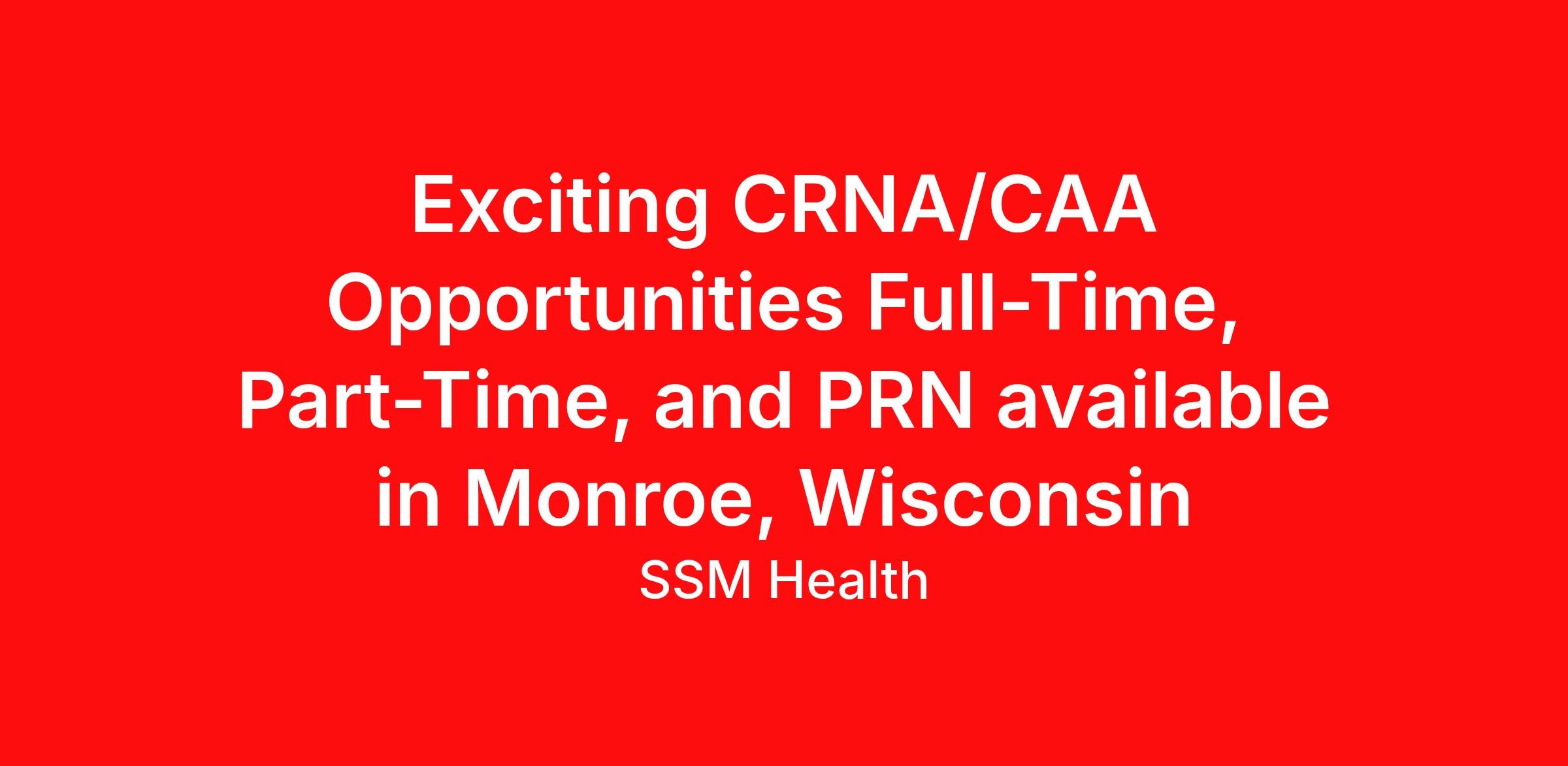 SSM Health is an Equal Opportunity Employer: Community Description: About SSM Health Monroe Hospital: Fulfill your calling at SSM Health Monroe Hospital in Anesthesia At SSM Health , we are committed to delivering outstanding healthcare services, and SSM Health Monroe Hospital is actively recruiting anesthetists to join our collegial department! Join SSM Health Monroe Hospital to be part of a team that delivers exceptional, nationally recognized care . Serving a predominantly rural population allows us to build strong, lasting relationships with patients, reflected in consistently high patient experience scores. Our facility can employ CAAs or CRNAs. Candidates of all experience levels are welcome to apply! Why join us? Enjoy work/life harmony NO nights/weekends/holidays or call! 8-hour shifts Monday-Friday Full-time, part-time, and PRN schedules available Practice in a new, state-of-the-art facility ! Our smaller team fosters a close-knit, family-like atmosphere We value every team member's voice and believe those delivering care are best positioned to drive improvements. Opportunities to participate in Shared Decision-Making Councils. Diverse case mix Serving pediatric, adult, and geriatric populations ENT, ophthalmology, general, ortho, OB, Vascular, podiatry, dental, urology Competitive financial package - inquire for details: Competitive, experience-based pay Robust benefits coverage within your first 30 days! Medical, life, and disability insurance available Retirement plan with employer match CME, PTO more! Your Qualifications: Graduate of nationally accredited Certified Anesthesia Assistant (CAA) or Certified Registered Nurse Anesthetist (CRNA) Program Ability to obtain CAA/CRNA licensure in Wisconsin BLS, ALS, and PALs certifications Your Skills: Strong communication and problem-solving skills Optimism, enthusiasm, and a proactive mindset At SSM Health Monroe Hospital, a state-of-the-art, 58-bed facility built in 2012, our goal is to serve the community and play an active role in it. From pediatrics to senior health, we take the time to listen and understand the needs of all our patients. We consistently offer the latest advances in medical services through individualized patient treatment. Forbes has named SSM Health Monroe Hospital as one their 2026 Top Hospitals. SSM Health in Monroe also includes rural family medicine residency and emergency medicine fellowship programs. Monroe, in the heart of Green County, blends Swiss heritage with small-town charm. Known as the Swiss Cheese Capital of the USA, it celebrates its rich dairy tradition with local cheese factories, craft breweries, and the popular Cheese Days festival. You'll discover unique shops, cozy caf&233;s, and beautifully preserved architecture in the historic downtown square. Outdoor lovers can explore scenic bike trails, parks, and nearby lakes. With excellent schools and affordable living, Monroe provides health care professionals with an ideal place to build their careers and enjoy a fulfilling lifestyle in a welcoming, family-friendly environment. SSM Health is committed to equal employment opportunity based on race, color, religion, national origin, gender, sexual orientation, gender identity, pregnancy, age, physical or mental disability, veteran status, and all other statuses protected by law. To view all of our current provider career opportunities, visit joinssmhealth.com. For the clinicians at SSM Health, being here means being part of a heartful heritage of healing. It?s an opportunity to further a caring legacy while advancing medicine with an esteemed organization that encourages collaboration, empowers innovation, supports growth, and seeks to elevate care for everyone we serve.