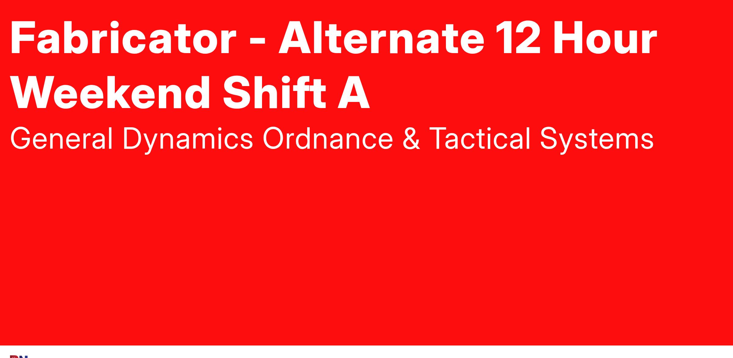 General Dynamics Ordnance and Tactical Systems (GD-OTS) is looking for an experienced Fabricator - Alternate 12 Hour Weekend A Shift (Friday morning 6:30 am - 7:00 pm Sunday evening) to join our Lincoln, NE organization. We are expanding rapidly and looking for motivated and creative individuals who want to help support and shape this organization as we grow.