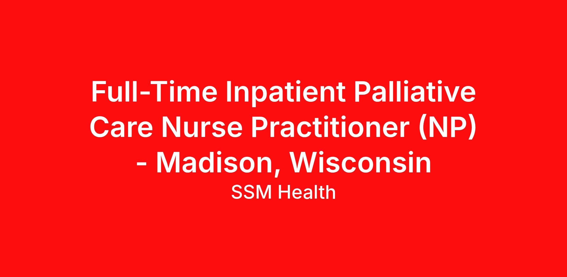SSM Health is an Equal Opportunity Employer: Community Description: About SSM Health St. Mary's Hospital - Madison: Bringing Peace and Comfort to Every Hospital Bed At SSM Health , we are committed to delivering exceptional healthcare services, and our SSM Health St. Mary's - Madison palliative care service is seeking a compassionate nurse practitioner to join our team. Apply today to join us in serving our mission! Opportunity Highlights: Inpatient consult service Great work/life balance 8-hour shifts Daytime hours, 8a-5p No nights/weekends! Collegial interdisciplinary team Robust financial package - inquire for details Experienced-based pay Benefits coverage within your first 30 days! (Health insurance, PTO, CME more!) Your Qualifications: Graduate of nationally accredited Nurse Practitioner (NP) Program Ability to obtain Wisconsin licensure & DEA Background in hospice or palliative care (RN or NP) At SSM Health St. Mary's Hospital – Madison, our goal is to serve the community and play an active role in it. For the third consecutive year, U.S. News & World Report recognized SSM Health St. Mary's Hospital - Madison as one of the best hospitals in Wisconsin (2024-2025). Forbes has also named SSM Health St. Mary's Hospital - Madison as one of their 2026 Top Hospitals. Serving South Central Wisconsin since 1912, SSM Health St. Mary's Hospital - Madison is a 440-bed hospital that offers a full range of inpatient and outpatient treatment and diagnostic services. St. Mary's Hospital is an American College of Surgeons-verified Level II Trauma Center, a Joint Commission-certified Thrombectomy-Capable Stroke Center, and has a Level III Neonatal Intensive Care Unit. Madison, the capital of Wisconsin, is a vibrant city known for its blend of natural beauty and vibrant urban life. Nestled between Lake Mendota and Lake Monona, the city is home to the University of Wisconsin–Madison and enjoys a lively atmosphere fueled by innovation, education, and cultural diversity. Madison boasts an award-winning food scene, expansive beautiful park systems, and a commitment to sustainability that enhances the quality of life. Whether you're savoring local flavors, enjoying live music, or embracing the city's commitment to sustainability, you'll find a welcoming and dynamic environment that feels like home. SSM Health is committed to equal employment opportunity based on race, color, religion, national origin, gender, sexual orientation, gender identity, pregnancy, age, physical or mental disability, veteran status, and all other statuses protected by law. To view all of our current provider career opportunities, visit joinssmhealth.com. For the clinicians at SSM Health, being here means being part of a heartful heritage of healing. It?s an opportunity to further a caring legacy while advancing medicine with an esteemed organization that encourages collaboration, empowers innovation, supports growth, and seeks to elevate care for everyone we serve.