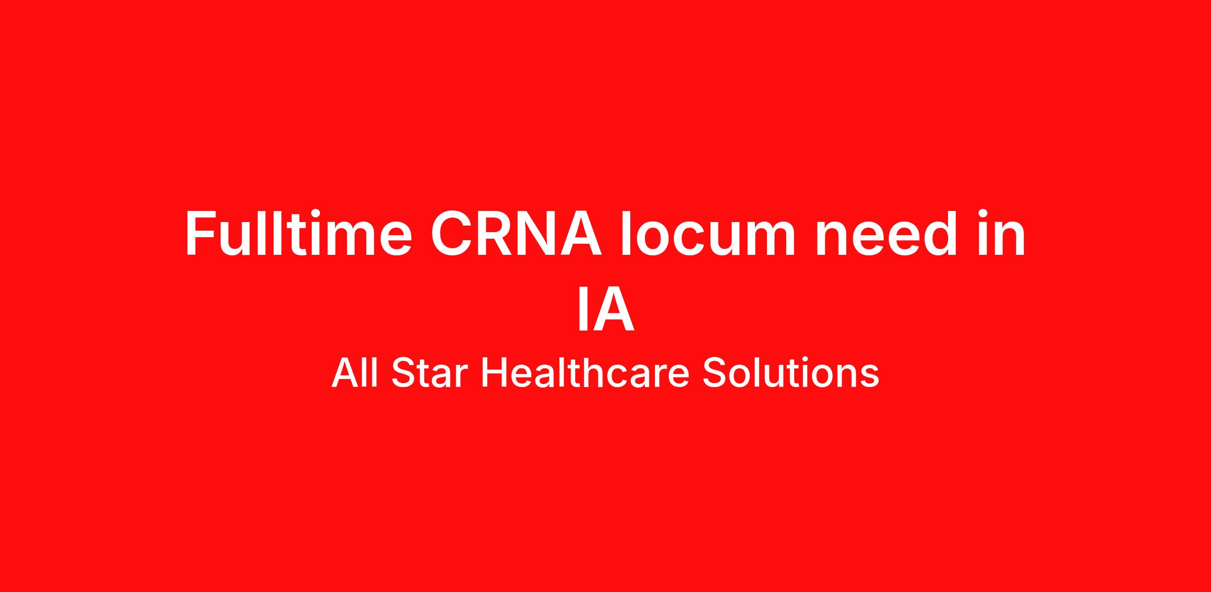 Specialty: CRNA Additional Information 5 days/week supporting OR, Mon - Fri 8hs CRNA practices independently General, Ortho, GI, Urology, ENT, OB. No Head/Heart. General, GI, and Ortho make up majority of cases. Active IA CRNA License or Active Compact License  Clean Malpractice/Background History - [REQUIRED] About All-Star Healthcare Solutions Benefits Dedicated, specialty-specific consultants Signature Red Carpet Service Help with credentialing and licensing Malpractice coverage included Competitive pay Paid travel and housing Full-service locums and perm staffing NALTO® member Purpose-driven mission to improve patient care Note: Additional details such as start date, shift schedule, procedures, and patient load will be provided upon inquiry.