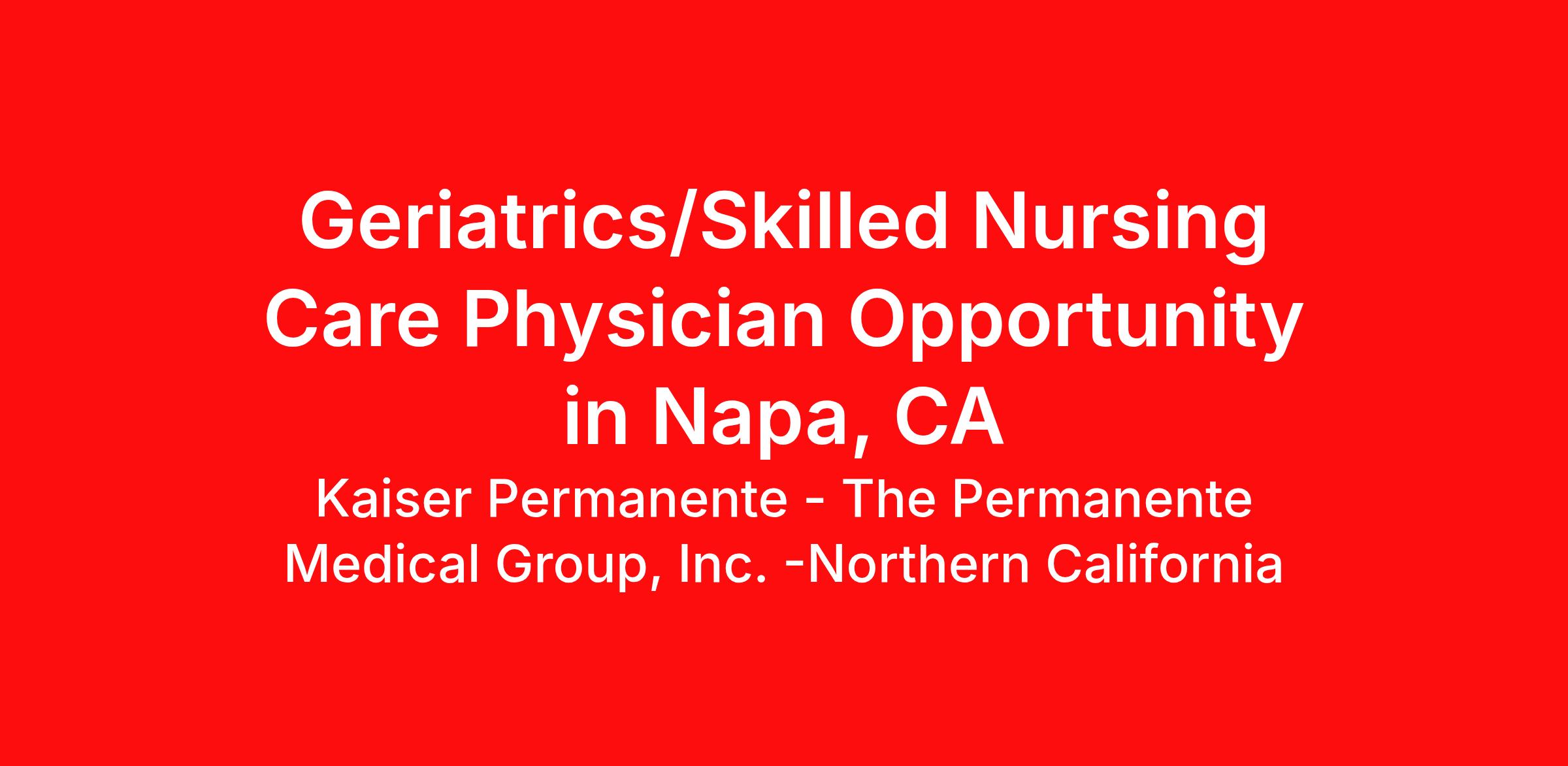 Skilled Nursing Facility Physician Opportunity: Full-time opening for a Geriatrician/Skilled Nursing Care Physician. We are seeking a Geriatrician or IM/FM trained Physician to cover skilled patients and follow long-term care patients in Napa, CA. This position is essential to cover our Skilled Nursing Facility patients in Napa which spans four facilities for both skilled and custodial patients, as well as home-based Palliative Care patients. Geriatrics and/or Hospital Medicine experience preferred. Travel to/from Skilled Nursing Facilities in Napa and Napa Medical Office. We are looking for a Physician with a passion for improving the quality of life of our most vulnerable population and their families to work in the Post-Acute and Long-Term Care arena. Full-time annual salary range is $320,040 to $330,000 plus additional potential incentives up to $44,350*. Reduced schedules with pro-rated compensation may be available. *Some incentive opportunities are estimates based on potential premium pay. For a list of open locations, please visit our online careers website: https://northerncalifornia.permanente.org/jobs/type/geriatrics A FEW REASONS TO CONSIDER A PRACTICE WITH TPMG: Work-life balance focused practice, including flexible schedules and unmatched practice support. We can focus on providing excellent patient care without managing overhead and billing. No RVUs! We are committed to cultivating and preserving an inclusive environment for all physicians and employees. Multi-specialty collaboration with a mission-driven integrated health care delivery model. An outstanding electronic medical record system that allows flexibility in patient management. We have a very rich and comprehensive Physician Health & Wellness Program. We are Physician-led and develop our own leaders. Professional development opportunities in teaching, research, mentorship, physician leadership, and community service. EXTRAORDINARY BENEFITS: Competitive compensation and benefits package, including comprehensive vision, medical, and dental Interest Free Home Loan Program up to $250,000 (approval required) Relocation Assistance up to $10,000 (approval required) PSLF Eligible Employer Malpractice and Tail Insurance Life Insurance Optional Long-Term Care Insurance Paid holidays, sick leave, and education leave Shareholder track Three retirement plans, including a pension plan and 401(k) TPMG is one of the largest medical groups in the nation with over 10,000 physicians, 21 medical centers, numerous clinics throughout Northern and Central California and an over 80-year tradition of providing quality medical care. If you are interested in learning more about this opportunity, please contact: Aileen Ludlow, Physician Recruiter at: Aileen.M.Ludlow@kp.org or call 510-239-9064. Please visit our website: https://northerncalifornia.permanente.org/career-opportunities We are an equal opportunity employer and VEVRAA federal contractor