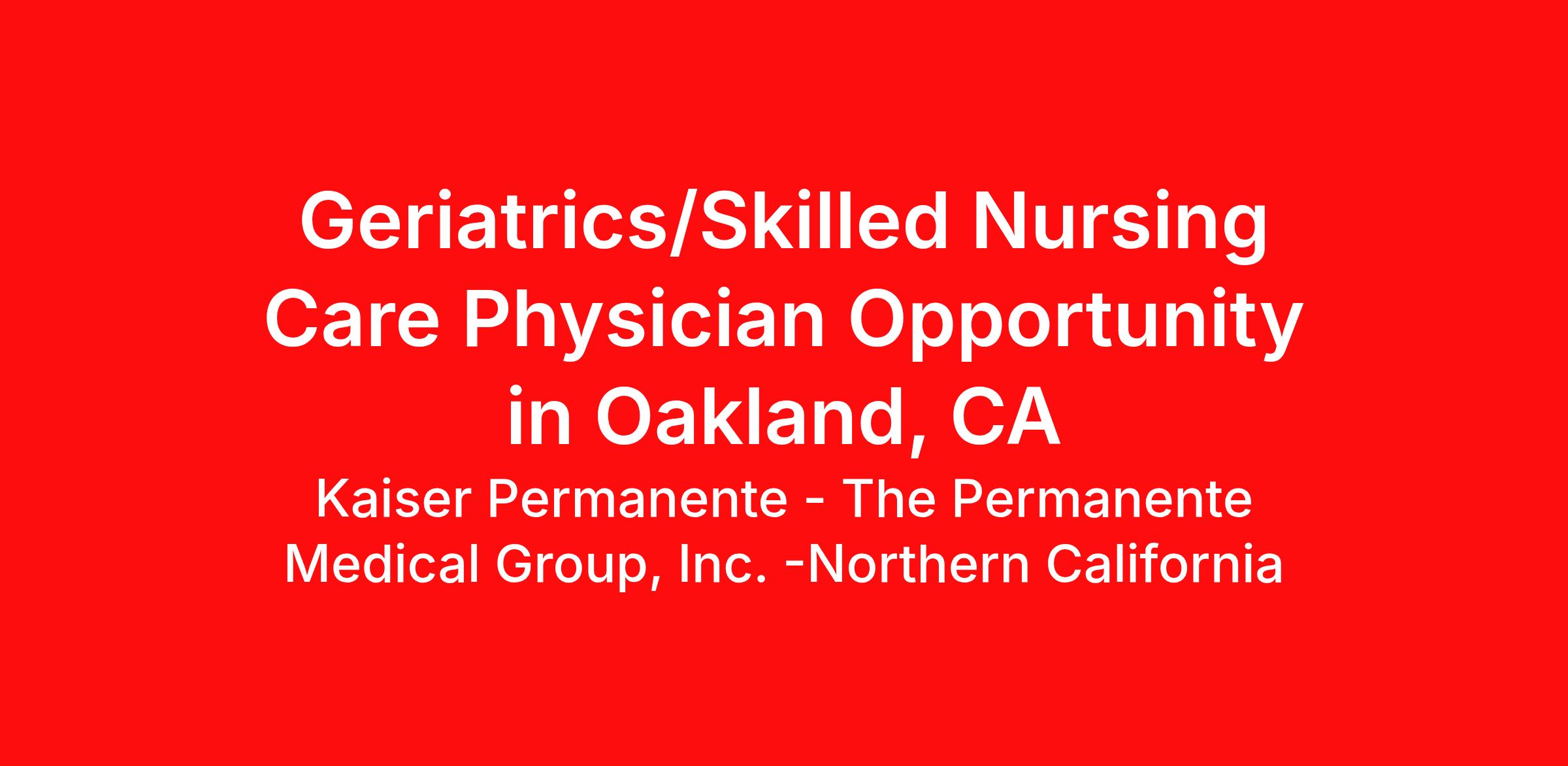 Skilled Nursing Facility Physician Opportunity: Full-time opening for a Geriatrician/Skilled Nursing Care Physician. We are looking for a Physician with a passion for improving the quality of life of our most vulnerable population and their families to work in the Post-Acute and Long-Term Care arena. We are seeking Geriatricians or IM/FM trained Physicians to cover skilled patients and follow long-term care patients in Oakland, CA. Full-time annual salary range is $320,040 to $330,000 plus additional potential incentives up to $44,350*. Reduced schedules with pro-rated compensation may be available. *Some incentive opportunities are estimates based on potential premium pay. For a list of open locations, please visit our online careers website: https://northerncalifornia.permanente.org/jobs/type/geriatrics A FEW REASONS TO CONSIDER A PRACTICE WITH TPMG: Work-life balance focused practice, including flexible schedules and unmatched practice support. We can focus on providing excellent patient care without managing overhead and billing. No RVUs! We are committed to cultivating and preserving an inclusive environment for all physicians and employees. Multi-specialty collaboration with a mission-driven integrated health care delivery model. An outstanding electronic medical record system that allows flexibility in patient management. We have a very rich and comprehensive Physician Health & Wellness Program. We are Physician-led and develop our own leaders. Professional development opportunities in teaching, research, mentorship, physician leadership, and community service. EXTRAORDINARY BENEFITS: Competitive compensation and benefits package, including comprehensive vision, medical, and dental Interest Free Home Loan Program up to $250,000 (approval required) Relocation Assistance up to $10,000 (approval required) PSLF Eligible Employer Malpractice and Tail Insurance Life Insurance Optional Long-Term Care Insurance Paid holidays, sick leave, and education leave Shareholder track Three retirement plans, including a pension plan and 401(k) TPMG is one of the largest medical groups in the nation with over 10,000 physicians, 21 medical centers, numerous clinics throughout Northern and Central California and an over 80-year tradition of providing quality medical care. If you are interested in learning more about this opportunity, please contact: Aileen Ludlow, Physician Recruiter at: Aileen.M.Ludlow@kp.org or call 510-239-9064. Please visit our website: https://northerncalifornia.permanente.org/career-opportunities We are an equal opportunity employer and VEVRAA federal contractor