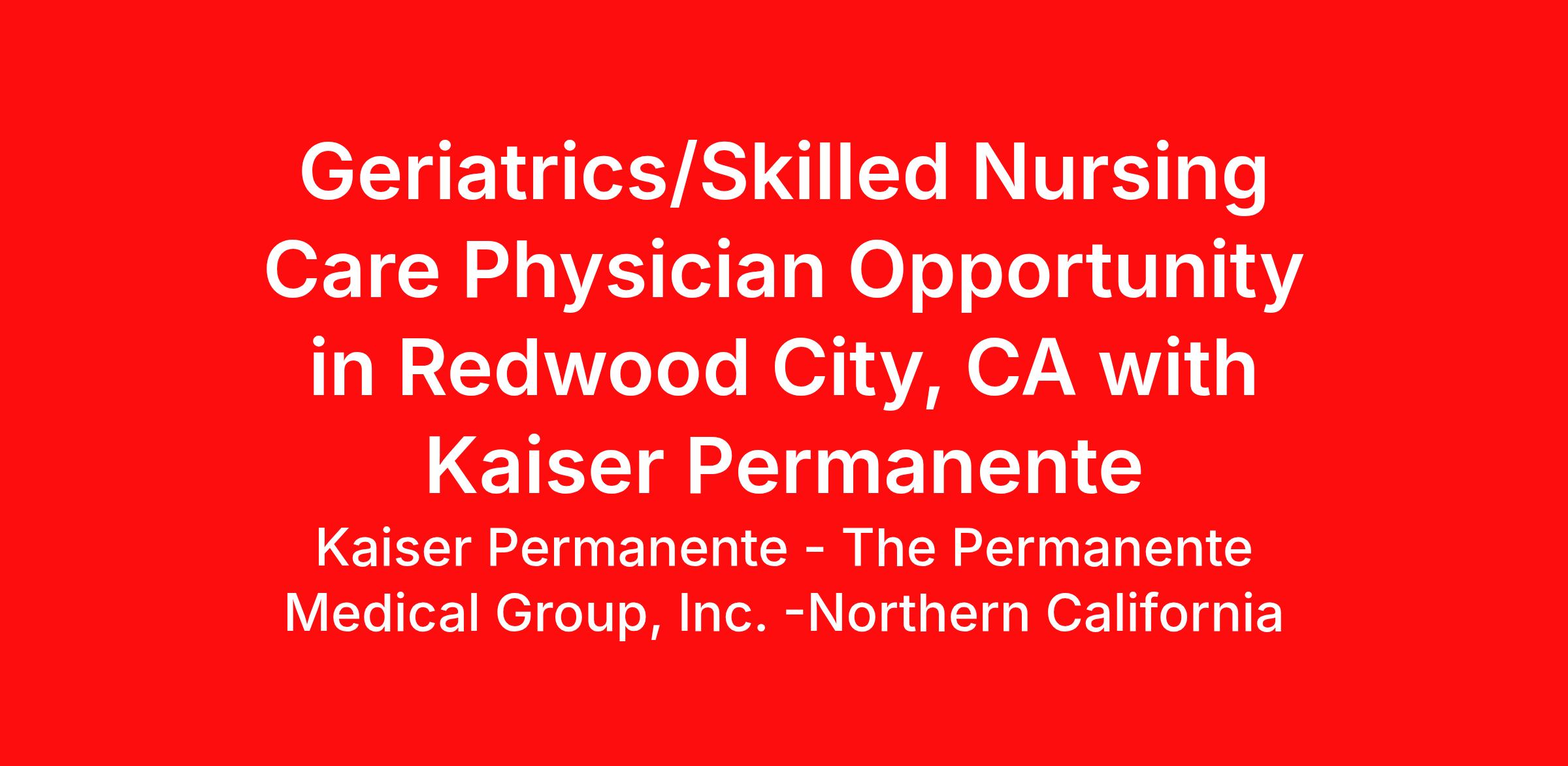 Skilled Nursing Facility Physician Opportunity: Part-time (6 units/30-hour week schedule) opening for a Geriatrician/Skilled Nursing Care Physician. We are looking for a Physician with a passion for improving the quality of life of our most vulnerable population and their families to work in the Post-Acute and Long-Term Care arena. We are seeking Geriatricians or IM/FM trained Physicians to cover skilled patients and follow long-term care patients in Redwood City, CA. Pro-rated salary based upon full-time annual salary range of $320,040 to $330,000 plus additional potential incentives up to $44,350*. *Some incentive opportunities are estimates based on potential premium pay. For a list of open locations, please visit our online careers website: https://northerncalifornia.permanente.org/jobs/type/geriatrics With TPMG you’ll benefit from: Work-life balance focused practice, including flexible schedules and unmatched practice support. We can focus on providing excellent patient care without managing overhead and billing . No RVUs! We are committed to cultivating and preserving an inclusive environment for all physicians and employees . Multi-specialty collaboration with a mission-driven integrated health care delivery model. An outstanding electronic medical record system that allows flexibility in patient management. We have a very rich and comprehensive Physician Health & Wellness Program . We are Physician-led and develop our own leaders. Professional development opportunities in teaching, research, mentorship, physician leadership, and community service. EXTRAORDINARY BENEFITS: Competitive compensation and benefits package, including comprehensive vision, medical, and dental Interest Free Home Loan Program up to $250,000 (approval required) Relocation Assistance up to $10,000 (approval required) PSLF Eligible Employer Malpractice and Tail Insurance Life Insurance Optional Long-Term Care Insurance Paid holidays, sick leave, and education leave Shareholder track Three retirement plans, including a pension plan and 401(k) TPMG is one of the largest medical groups in the nation with over 10,000 physicians, 21 medical centers, numerous clinics throughout Northern and Central California and an over 80-year tradition of providing quality medical care. If you are interested in learning more about this opportunity, please contact: Aileen Ludlow, Physician Recruiter at: Aileen.M.Ludlow@kp.org or call 510-239-9064. Please visit our website: https://northerncalifornia.permanente.org/career-opportunities We are an Equal Opportunity Employer and VEVRAA Federal Contractor.