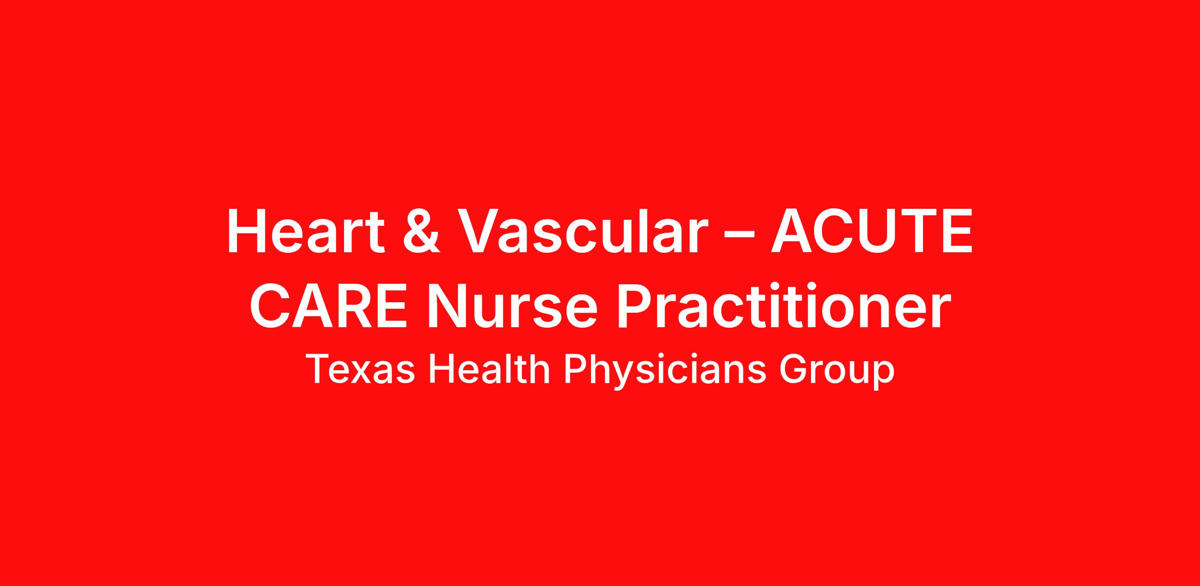 Improving the Health of the People in the Communities We Serve Heart & Vascular – ACUTE CARE Nurse Practitioner Texas Health Physicians Group is pleased to announce a full time opening for a Cardiovascular Acute Care Nurse Practitioner to join a team of leading diagnostic and interventional and non-interventional Cardiologists in Dallas, Texas. This is a great opportunity to work closely with board certified physicians who have a reputation for excellence in diagnosing and providing innovative treatments for cardiovascular diseases. Position Details: Full time, 40 hours per week. Hospital rounding and ICU Rounding Limited clinical coverage Electronic Medical Records Nuclear, Stress Tests, Echocardiogram all on site Take pride in offering a multidimensional approach to cardiac and peripheral vascular therapies Competitive Salary, plus comprehensive benefits package, CME, Malpractice & 401K Requirements Needed to Apply: Active Texas license Acute Care Board Certification and Experience Degree in NP studies from an approved Nurse Practitioner program 1-3 years of Cardiology experience preferred