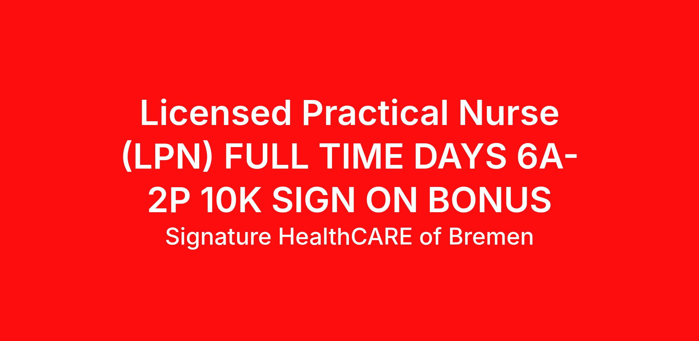 About Us : Signature HealthCARE of Bremen is a 97-bed offering short-term rehabilitative care as well as long-term care. It is our mission as a family-based organization to revolutionize the healthcare industry through a culture of resident centered healthcare services, personalized spirituality, and real quality of life initiatives. About Signature : Signature HealthCARE is a family-based healthcare company offering integrated services across multiple states. Our continuum of care includes skilled nursing, rehabilitation, assisted and memory care, and home-based services supported by innovative technologies like telehealth and Care.ai-enabled solutions. We are committed to advancing person-directed care and quality outcomes. Many of our facilities continue to receive high performance ratings and accreditations. As an award-winning organization recognized over the years by national outlets such as U.S. News & World Report , we take pride in fostering compassionate care environments and being an employer of choice in the healthcare industry. Overview : Are you a caring LPN looking to make strong connections and an impact on patients? If you want to work in an environment where you can become your best possible self JOIN US! You can find opportunities to grow your career through meaningful work, leading with a servant heart, professional development, and a great team to support you! Additional Details: $10,000 SIGN ON BONUS How you Will make a Difference: Deliver exceptional nursing services to our patients and residents maintaining the highest degree of quality and compassionate care. Supervision of day-to-day activities performed by assigned nursing assistants Operate in accordance with Federal, State, and Local Standards, guidelines and regulations and as required by Director of Nursing. Confirm that all nursing personnel assigned to you comply with the written policies and procedures established by the facility. What you Need to make a Difference: Possess an Active LPN license in the state of residence Current/active CPR Certification Strong attention to detail and accuracy, excellent organizational skills with the ability to prioritize, coordinate and simultaneously maintain multiple projects with a high level of quality and productivity. Excellent technical, assessment, and documentation skills with the ability to maintain confidentiality. Our exceptional Benefits Package and Signature Perks include the following and more! (if applicable): Medical, Dental and Vision – Voluntary Life/Disability 401(K) and Roth 401(K) Shift Differentials and Weekend Enhanced Hourly Rates Tuition Forgiveness/Education Reimbursement Uniform Allowance (Seventy-Five Dollars) for first-time newly hired stakeholders and continuous allotment Pay Advance and Next Day Pay! Paid Time Off (PTO) Reward & Recognition Program (HEART) VitalLinks Signature Inspire Foundation – providing a safety net for our stakeholders At Signature HealthCARE, our team members are permitted – no, encouraged – to employ their talents and abilities to solve problems. Our culture is built on three distinct pillars: Learning, Spirituality and Intra-preneurship. Each pillar has its own staff and initiatives, ensuring that our unique culture permeates the entire organization. Come see what the revolution is all about! Signature HealthCARE is an Equal Opportunity-Affirmative Action Employer – Minority / Female / Disability / Veteran and other protected categories Pay Range: Up to USD $28.44/Hr. Indeed Hashtag : INDIN