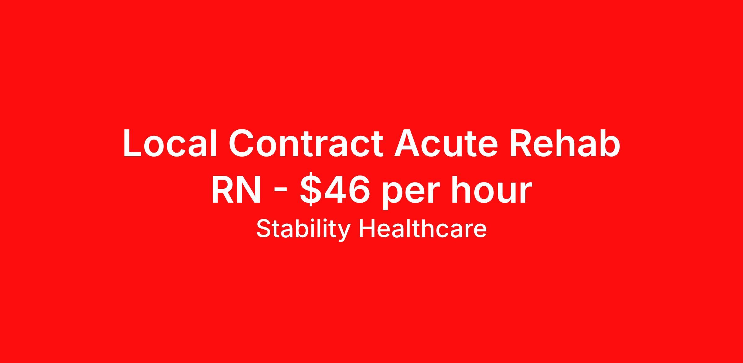 Stability Healthcare is seeking a local contract nurse RN Rehabilitation for a local contract nursing job in Evansville, Indiana. Job Description & Requirements Specialty: Rehabilitation Discipline: RN Duration: 13 weeks 36 hours per week Shift: 12 hours, days Employment Type: Local Contract Stability Healthcare is looking for a Rehab RN contract position in Evansville, IN. Rehabilitation Nurses help patients, who still require some nursing care, adapt physically and emotionally to lifestyle changes and teaches them new skills as well as providing other nursing care. The primary goals of a Rehab Nurse is to help patients attain or maintain maximum function. *$600 travel bonus *Day 1 health insurance with United Healthcare *PTO plan start accruing on day 1, use during contract or cash out at the end! *Guaranteed stipend if facility calls you off *Extra hour bonus earn an additional hourly bonus for working over your weekly contracted hours Stability Job ID L-827482. Pay package is based on 12 hour shifts and 36 hours per week (subject to confirmation) with tax-free stipend amount to be determined. Posted job title: Rehab About Stability Healthcare Stability Healthcare was founded in 2009, with the mission of becoming the best Travel Nursing Agency in California. We have been rated one of the top travel nursing agencies and offer our nurses the highest paying travel nursing jobs available. We have access to the best travel assignments from 1000’s of facilities. You can start the year off in sunny California, spend the Spring in the Colorado Rockies, enjoy the Summer in the Mid-West, experience the change of seasons in Boston and New York, and hit the beaches of Florida in the winter. Our Nurses work in the best hospitals and health systems in the country. Benefits Guaranteed Hours Benefits start day 1