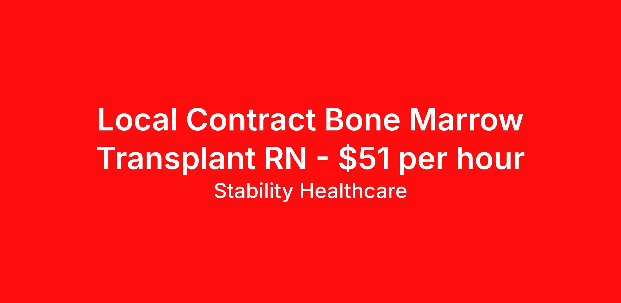 Stability Healthcare is seeking a local contract nurse RN Bone Marrow Transplant for a local contract nursing job in Webster, Texas. Job Description & Requirements Specialty: Bone Marrow Transplant Discipline: RN Duration: 13 weeks 36 hours per week Shift: 12 hours, nights Employment Type: Local Contract Stability Healthcare is looking for a BMT/Hemonc RN contract position in Webster, TX. The role of the hematology / oncology / BMT nurse is to administer patient care in a specialized manner to patients who are preparing for bone marrow transplant or recovering from one. The nurse may be required to administer special medications and care due to high infection susceptibility caused by their immunosuppressed status. *$600 travel bonus *Day 1 health insurance with United Healthcare *PTO plan start accruing on day 1, use during contract or cash out at the end! *Guaranteed stipend if facility calls you off *Extra hour bonus earn an additional hourly bonus for working over your weekly contracted hours Stability Job ID L-818123. Pay package is based on 12 hour shifts and 36 hours per week (subject to confirmation) with tax-free stipend amount to be determined. Posted job title: BMT/Hemonc About Stability Healthcare Stability Healthcare was founded in 2009, with the mission of becoming the best Travel Nursing Agency in California. We have been rated one of the top travel nursing agencies and offer our nurses the highest paying travel nursing jobs available. We have access to the best travel assignments from 1000’s of facilities. You can start the year off in sunny California, spend the Spring in the Colorado Rockies, enjoy the Summer in the Mid-West, experience the change of seasons in Boston and New York, and hit the beaches of Florida in the winter. Our Nurses work in the best hospitals and health systems in the country. Benefits Guaranteed Hours Benefits start day 1