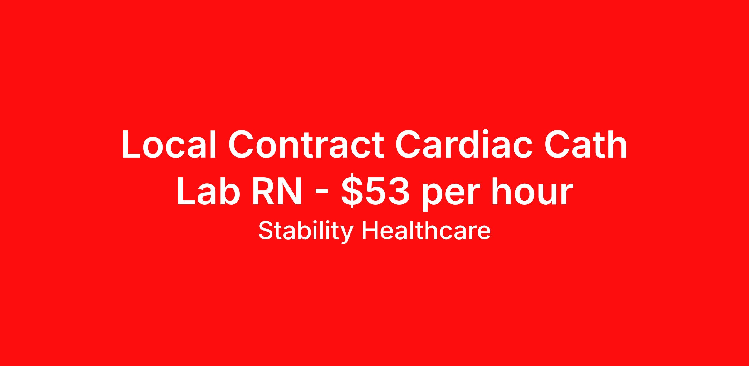 Stability Healthcare is seeking a local contract nurse RN Cardiac Cath Lab for a local contract nursing job in Ocala, Florida. Job Description & Requirements Specialty: Cardiac Cath Lab Discipline: RN Duration: 13 weeks 36 hours per week Shift: 12 hours, days Employment Type: Local Contract Stability Healthcare is looking for a Cath Lab RN contract position in Ocala, FL. Cath lab nurses care for patients while they are undergoing different procedures in a cath lab. Nurses who work in the cardiac catheterization lab (CCL) will assist the doctor in performing interventional procedures like cardiac catheterizations, valvuloplasties, and angioplasties. *$600 travel bonus *Day 1 health insurance with United Healthcare *PTO plan start accruing on day 1, use during contract or cash out at the end! *Guaranteed stipend if facility calls you off *Extra hour bonus earn an additional hourly bonus for working over your weekly contracted hours Stability Job ID L-814350. Pay package is based on 12 hour shifts and 36 hours per week (subject to confirmation) with tax-free stipend amount to be determined. Posted job title: Cath Lab About Stability Healthcare Stability Healthcare was founded in 2009, with the mission of becoming the best Travel Nursing Agency in California. We have been rated one of the top travel nursing agencies and offer our nurses the highest paying travel nursing jobs available. We have access to the best travel assignments from 1000’s of facilities. You can start the year off in sunny California, spend the Spring in the Colorado Rockies, enjoy the Summer in the Mid-West, experience the change of seasons in Boston and New York, and hit the beaches of Florida in the winter. Our Nurses work in the best hospitals and health systems in the country. Benefits Guaranteed Hours Benefits start day 1