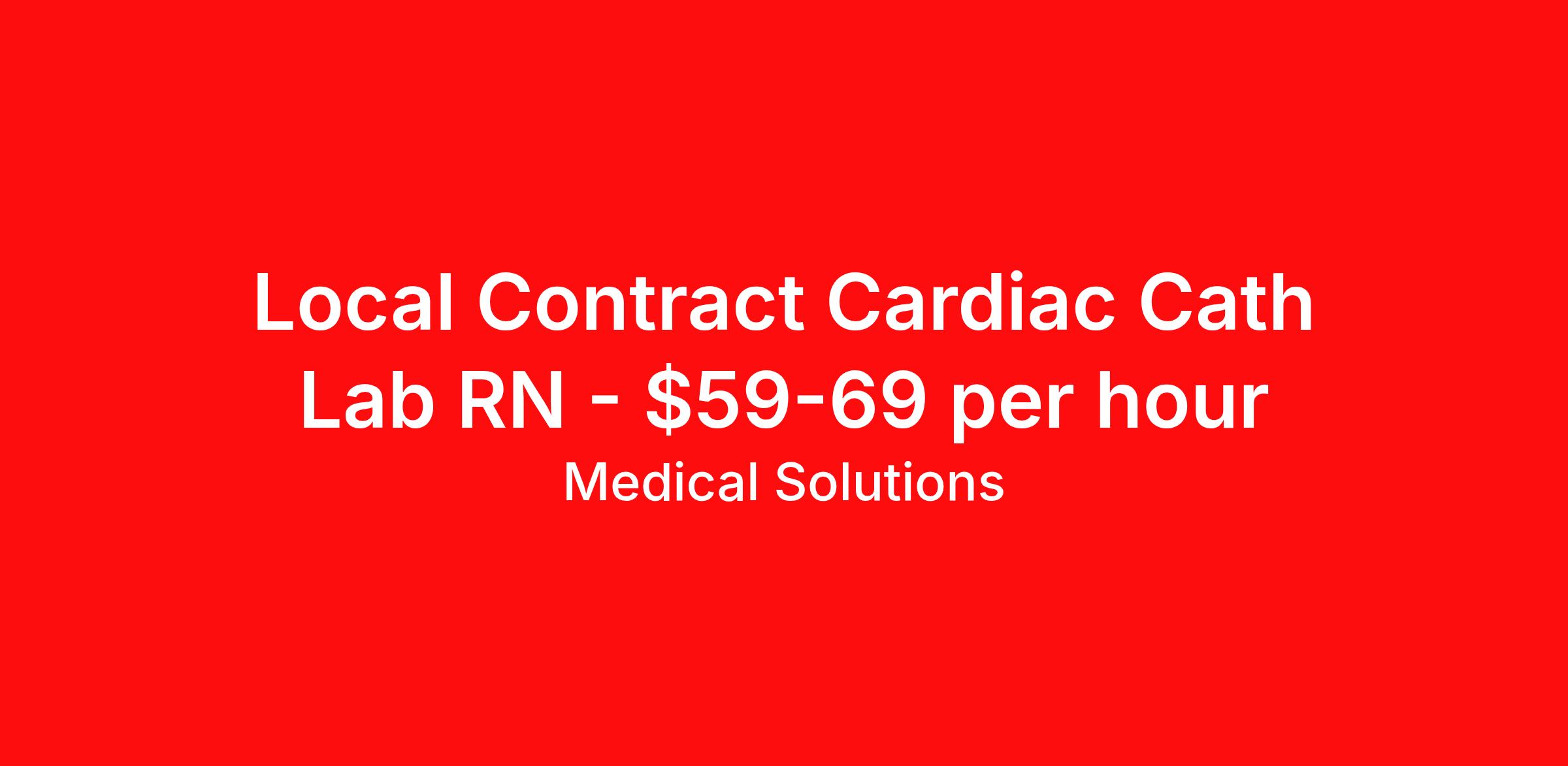 Medical Solutions is seeking a local contract nurse RN Cardiac Cath Lab for a local contract nursing job in Soldotna, Alaska. Job Description & Requirements Specialty: Cardiac Cath Lab Discipline: RN Duration: 16 weeks 40 hours per week Shift: 8 hours, days Employment Type: Local Contract We’re seeking talented healthcare professionals whose adventure game is as strong as their clinical game. Those that want flexibility and high pay, we have the positions for you! Some of the industry-leading benefits enjoyed by Medical Solutions travel nurses and travel allied healthcare professionals include: Day One Medical, Dental, and Vision with low premiums Day One 401(k) with Company Contribution Personalized Compensation Packages Paid, Private, Fully Furnished, Pet-Friendly Housing Dedicated Recruiter and 24/7 Customer Care Line Per Diem Allowance and Paid Travel Licensure and Certification Reimbursement Free Liability Coverage Voluntary Benefits: Critical Illness, Hospital Indemnity, Accident, and Pet Insurance Equal Employment Opportunity And More! Estimated pay package based on bill rate at time job was posted. Bill rates can change frequently and without notice. Exact pay package may vary based on guaranteed hours, distance being traveled, and customizations available for travelers. Performs the primary functions of a Registered Nurse in assessing, planning, implementing and evaluating the care of all patients in Cardiac Cath Lab Services during his or her shift. Is responsible for meeting the established standards of Intensive Nursing Practice, for managing all assigned personnel, supplies, and equipment in the unit, and for promoting teamwork with physicians and personnel of other departments. Under general supervision, performs professional nursing, technical and administrative duties as they relate to the cardiac services department as assigned. Perform circulate, scrub and hemodynamic monitoring duties with diagnostic and interventional cardiac procedures, interventional radiology procedures, holding area procedures, and Imaging Department nursing care support using clinical knowledge, technical skills and professional judgment in accordance with professional and departmental standards and protocols to include moderate sedation. Provides care, assessment prior, during and post-procedural care and instruction to patients. Prepares and maintains all pertinent information related to procedures. Call for more info Medical Solutions Job ID 1070342L. Posted job title: Cardiac Cath Lab About Medical Solutions At Medical Solutions, we’re people who care, helping people who care. No matter how you look at it, there’s a whole lot of care going on in our world and that’s just the way we like it. What do we do? Medical Solutions is one of the nation’s largest providers of total workforce solutions in the healthcare industry, connecting nurses and allied health clinicians with hospitals and healthcare systems across the country and around the corner. Through our family of brands, we also serve a segment of clients outside of the healthcare space. And we’re the very best at what we do. You’ll love our culture that’s filled with heart and soul. As a company and employer, we’re sincerely and unabashedly us. We lead as humans first and believe the unique qualities of each team member make us better together. We share a purpose for helping others and the drive to make a difference. And we offer endless opportunities for personal and professional growth, throughout your career. At Medical Solutions, you’ll find a great place to work and a career home. We’ve received Best Places to Work awards, landed top industry awards, and received accolades for the impact we’ve made in business and within our community. But the only way to really get to know us, is to join us. We think you’ll fit right in. Benefits Weekly pay Holiday Pay Guaranteed Hours Continuing Education 401k retirement plan Pet insurance Company provided housing options Cancelation protection Wellness and fitness programs Mileage reimbursement Referral bonus Employee assistance programs Medical benefits Dental benefits Vision benefits Benefits start day 1 License and certification reimbursement Life insurance Discount program