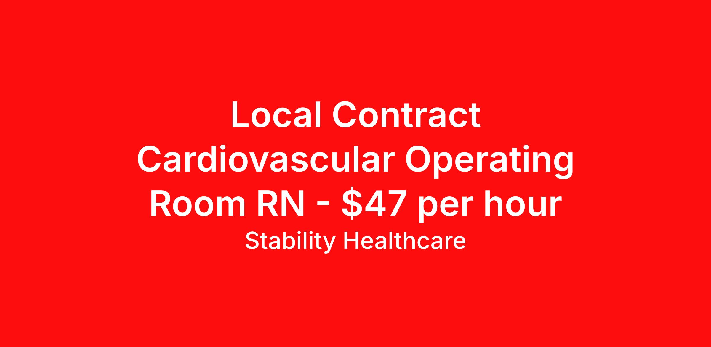 Stability Healthcare is seeking a local contract nurse RN CVOR for a local contract nursing job in Webster, Texas. Job Description & Requirements Specialty: CVOR Discipline: RN Duration: 13 weeks 36 hours per week Shift: 12 hours, days Employment Type: Local Contract Stability Healthcare is looking for a CVOR RN contract position in Webster, TX. CVOR nurse jobs focus on the treatment of cardiovascular patients, including operating bypass machines and administering anesthesia. They care for cardiovascular patients before, during and following surgical procedures. *$600 travel bonus *Day 1 health insurance with United Healthcare *PTO plan start accruing on day 1, use during contract or cash out at the end! *Guaranteed stipend if facility calls you off *Extra hour bonus earn an additional hourly bonus for working over your weekly contracted hours Stability Job ID L-818130. Pay package is based on 12 hour shifts and 36 hours per week (subject to confirmation) with tax-free stipend amount to be determined. Posted job title: CVOR About Stability Healthcare Stability Healthcare was founded in 2009, with the mission of becoming the best Travel Nursing Agency in California. We have been rated one of the top travel nursing agencies and offer our nurses the highest paying travel nursing jobs available. We have access to the best travel assignments from 1000’s of facilities. You can start the year off in sunny California, spend the Spring in the Colorado Rockies, enjoy the Summer in the Mid-West, experience the change of seasons in Boston and New York, and hit the beaches of Florida in the winter. Our Nurses work in the best hospitals and health systems in the country. Benefits Guaranteed Hours Benefits start day 1
