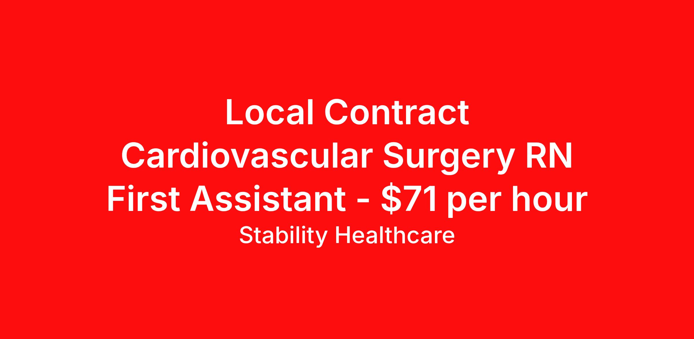 Stability Healthcare is seeking a local contract nurse RN CVOR First Assist for a local contract nursing job in Lansing, Michigan. Job Description & Requirements Specialty: CVOR First Assist Discipline: RN Duration: 13 weeks 40 hours per week Shift: 10 hours, days Employment Type: Local Contract Stability Healthcare is looking for a RNFA RN contract position in Lansing, MI. RNFA's are highly trained and skilled in surgical procedures, and they have completed additional education and certification to qualify for this role. They work under the supervision of a surgeon, and their responsibilities can include positioning the patient, preparing the surgical site, handling instruments, providing tissue retraction, and suturing incisions. RNFA's play a critical role in ensuring patient safety during surgical procedures, and their expertise helps to improve surgical outcomes. *$600 travel bonus *Day 1 health insurance with United Healthcare *PTO plan start accruing on day 1, use during contract or cash out at the end! *Guaranteed stipend if facility calls you off *Extra hour bonus earn an additional hourly bonus for working over your weekly contracted hours Stability Job ID L-818009. Pay package is based on 10 hour shifts and 40 hours per week (subject to confirmation) with tax-free stipend amount to be determined. Posted job title: RNFA About Stability Healthcare Stability Healthcare was founded in 2009, with the mission of becoming the best Travel Nursing Agency in California. We have been rated one of the top travel nursing agencies and offer our nurses the highest paying travel nursing jobs available. We have access to the best travel assignments from 1000’s of facilities. You can start the year off in sunny California, spend the Spring in the Colorado Rockies, enjoy the Summer in the Mid-West, experience the change of seasons in Boston and New York, and hit the beaches of Florida in the winter. Our Nurses work in the best hospitals and health systems in the country. Benefits Guaranteed Hours Benefits start day 1