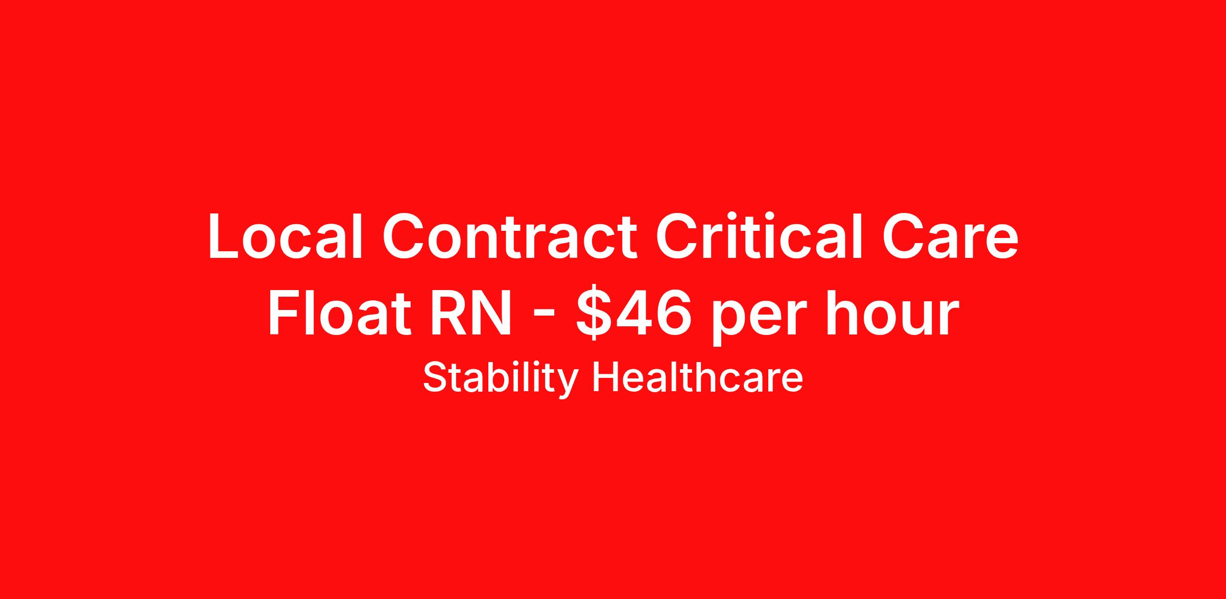 Stability Healthcare is seeking a local contract nurse RN Float ICU - Intensive Care Unit Med Surg for a local contract nursing job in Cartersville, Georgia. Job Description & Requirements Specialty: ICU - Intensive Care Unit Discipline: RN Duration: 8 weeks 36 hours per week Shift: 12 hours, nights Employment Type: Local Contract Stability Healthcare is looking for a ICU RN contract position in Cartersville, GA. Intensive Care Unit (ICU) Nurses treat acutely ill patients with life-threatening conditions, in settings requiring continuous vigilance and high-intensity therapies. ICU nurses can specialize in a variety of disciplines including medical, surgical, cardiac, burn or Neuro ICU. *$600 travel bonus *Day 1 health insurance with United Healthcare *PTO plan start accruing on day 1, use during contract or cash out at the end! *Guaranteed stipend if facility calls you off *Extra hour bonus earn an additional hourly bonus for working over your weekly contracted hours Stability Job ID L-818969. Pay package is based on 12 hour shifts and 36 hours per week (subject to confirmation) with tax-free stipend amount to be determined. Posted job title: ICU About Stability Healthcare Stability Healthcare was founded in 2009, with the mission of becoming the best Travel Nursing Agency in California. We have been rated one of the top travel nursing agencies and offer our nurses the highest paying travel nursing jobs available. We have access to the best travel assignments from 1000’s of facilities. You can start the year off in sunny California, spend the Spring in the Colorado Rockies, enjoy the Summer in the Mid-West, experience the change of seasons in Boston and New York, and hit the beaches of Florida in the winter. Our Nurses work in the best hospitals and health systems in the country. Benefits Guaranteed Hours Benefits start day 1