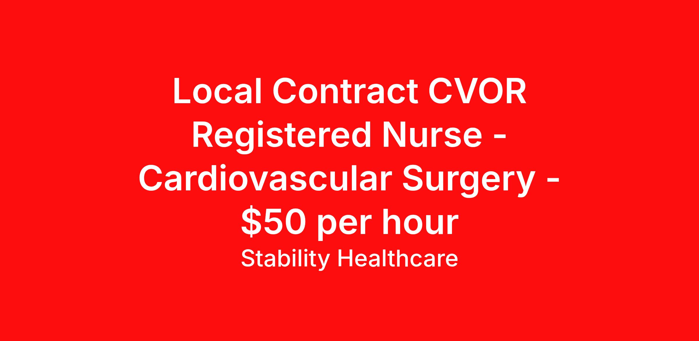 Stability Healthcare is seeking a local contract nurse RN CVOR for a local contract nursing job in Dallas, Texas. Job Description & Requirements Specialty: CVOR Discipline: RN Duration: 13 weeks 40 hours per week Shift: 10 hours, days Employment Type: Local Contract Stability Healthcare is looking for a CVOR RN contract position in Dallas, TX. CVOR nurse jobs focus on the treatment of cardiovascular patients, including operating bypass machines and administering anesthesia. They care for cardiovascular patients before, during and following surgical procedures. *$600 travel bonus *Day 1 health insurance with United Healthcare *PTO plan start accruing on day 1, use during contract or cash out at the end! *Guaranteed stipend if facility calls you off *Extra hour bonus earn an additional hourly bonus for working over your weekly contracted hours Stability Job ID L-838004. Pay package is based on 10 hour shifts and 40 hours per week (subject to confirmation) with tax-free stipend amount to be determined. Posted job title: CVOR About Stability Healthcare Stability Healthcare was founded in 2009, with the mission of becoming the best Travel Nursing Agency in California. We have been rated one of the top travel nursing agencies and offer our nurses the highest paying travel nursing jobs available. We have access to the best travel assignments from 1000’s of facilities. You can start the year off in sunny California, spend the Spring in the Colorado Rockies, enjoy the Summer in the Mid-West, experience the change of seasons in Boston and New York, and hit the beaches of Florida in the winter. Our Nurses work in the best hospitals and health systems in the country. Benefits Guaranteed Hours Benefits start day 1
