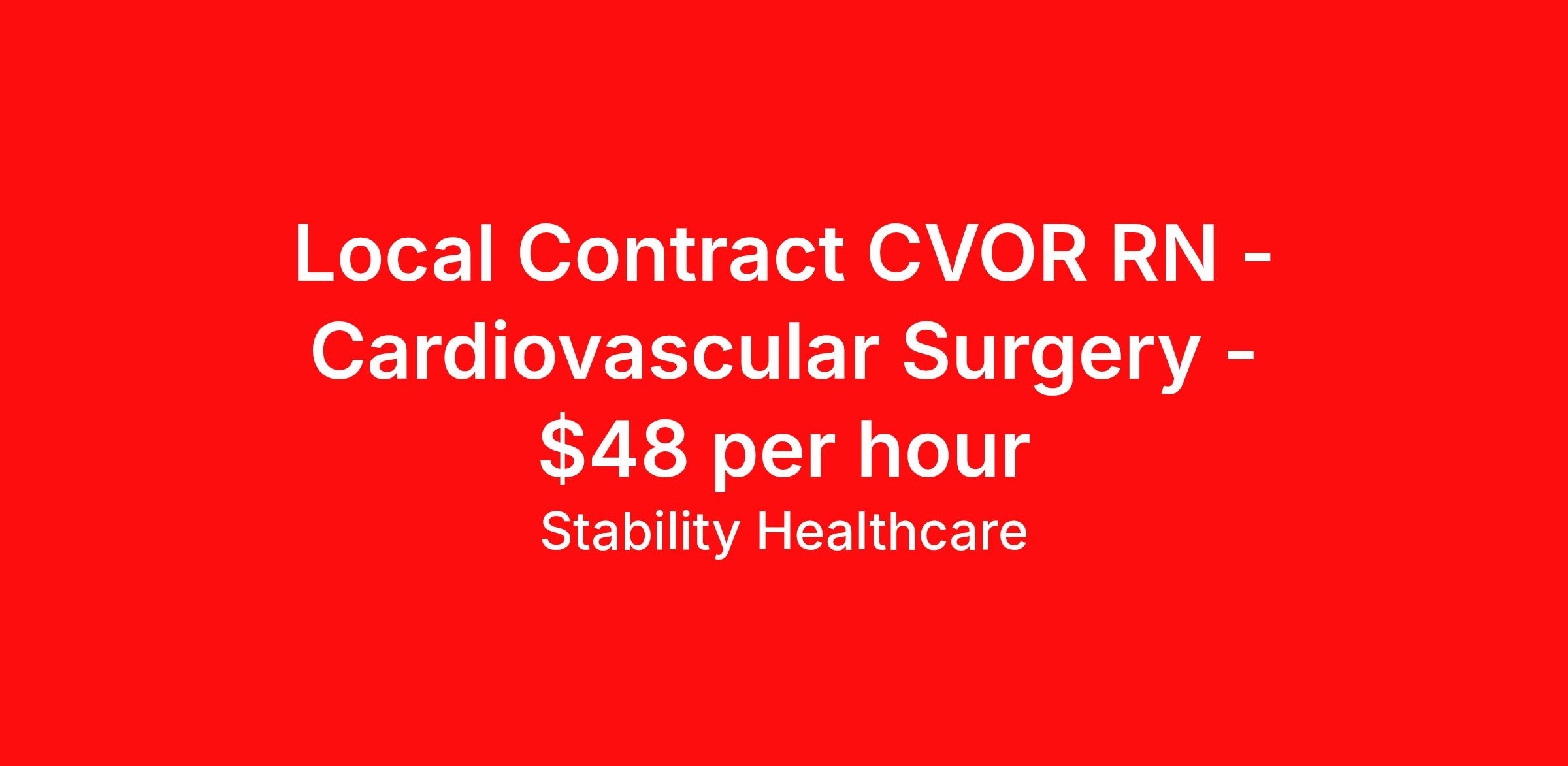 Stability Healthcare is seeking a local contract nurse RN OR - Operating Room for a local contract nursing job in McKinney, Texas. Job Description & Requirements Specialty: OR - Operating Room Discipline: RN Duration: 13 weeks 36 hours per week Shift: 12 hours, days Employment Type: Local Contract Stability Healthcare is looking for a CVOR RN contract position in McKinney, TX. CVOR nurse jobs focus on the treatment of cardiovascular patients, including operating bypass machines and administering anesthesia. They care for cardiovascular patients before, during and following surgical procedures. *$600 travel bonus *Day 1 health insurance with United Healthcare *PTO plan start accruing on day 1, use during contract or cash out at the end! *Guaranteed stipend if facility calls you off *Extra hour bonus earn an additional hourly bonus for working over your weekly contracted hours Stability Job ID L-838002. Pay package is based on 12 hour shifts and 36 hours per week (subject to confirmation) with tax-free stipend amount to be determined. Posted job title: CVOR About Stability Healthcare Stability Healthcare was founded in 2009, with the mission of becoming the best Travel Nursing Agency in California. We have been rated one of the top travel nursing agencies and offer our nurses the highest paying travel nursing jobs available. We have access to the best travel assignments from 1000’s of facilities. You can start the year off in sunny California, spend the Spring in the Colorado Rockies, enjoy the Summer in the Mid-West, experience the change of seasons in Boston and New York, and hit the beaches of Florida in the winter. Our Nurses work in the best hospitals and health systems in the country. Benefits Guaranteed Hours Benefits start day 1