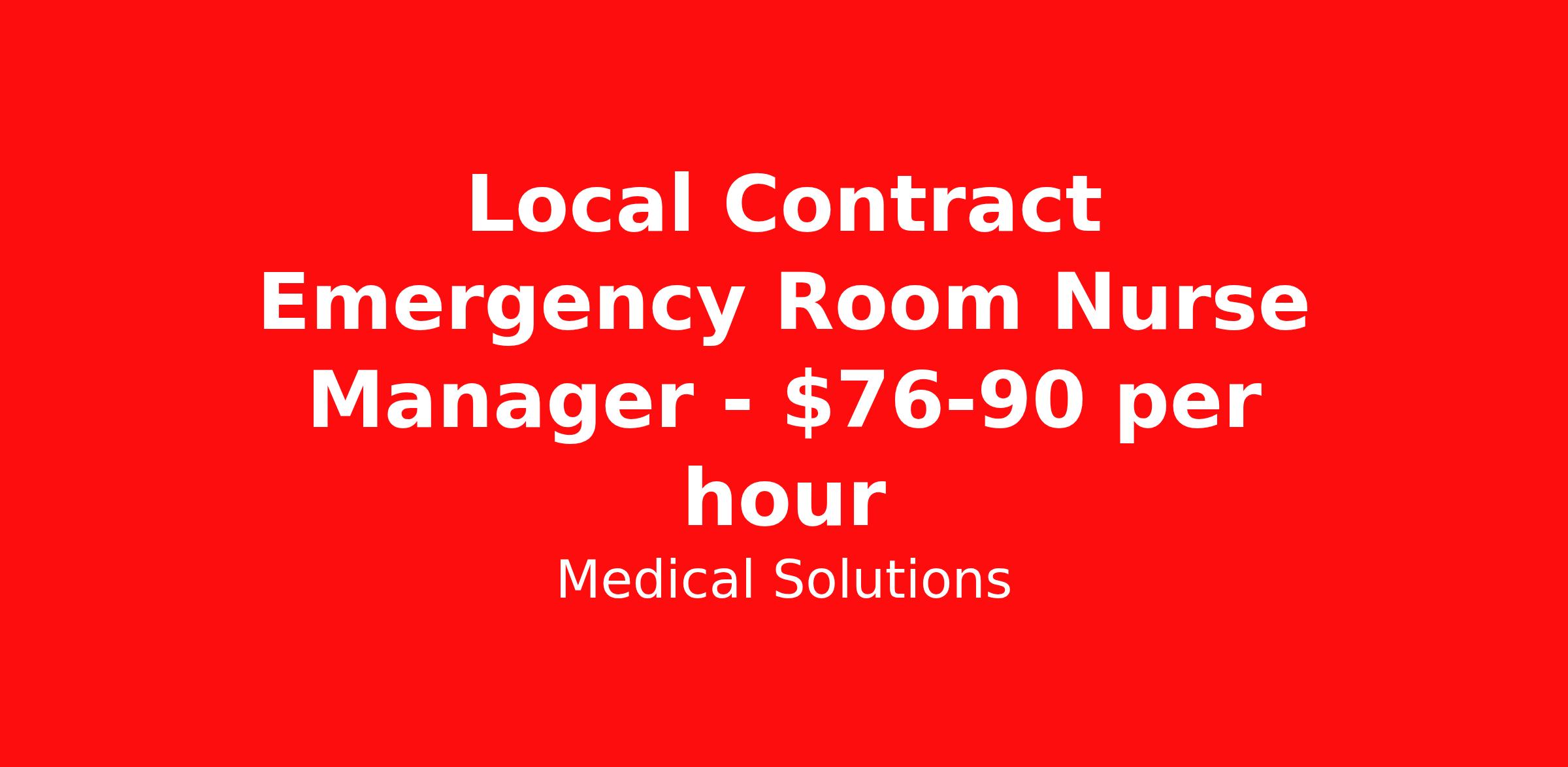Medical Solutions is seeking a local contract nurse RN Manager, ED - Emergency Department for a local contract nursing job in Templeton, California. Job Description & Requirements Specialty: ED - Emergency Department Discipline: RN Duration: 13 weeks 40 hours per week Shift: 8 hours, days Employment Type: Local Contract We’re seeking talented healthcare professionals whose adventure game is as strong as their clinical game. Those that want flexibility and high pay, we have the positions for you! Some of the industry-leading benefits enjoyed by Medical Solutions travel nurses and travel allied healthcare professionals include: Day One Medical, Dental, and Vision with low premiums Day One 401(k) with Company Contribution Personalized Compensation Packages Paid, Private, Fully Furnished, Pet-Friendly Housing Dedicated Recruiter and 24/7 Customer Care Line Per Diem Allowance and Paid Travel Licensure and Certification Reimbursement Free Liability Coverage Voluntary Benefits: Critical Illness, Hospital Indemnity, Accident, and Pet Insurance Equal Employment Opportunity And More! Estimated pay package based on bill rate at time job was posted. Bill rates can change frequently and without notice. Exact pay package may vary based on guaranteed hours, distance being traveled, and customizations available for travelers. Medical Solutions Job ID 1076443L. Posted job title: ER (Emergency Room) About Medical Solutions At Medical Solutions, we’re people who care, helping people who care. No matter how you look at it, there’s a whole lot of care going on in our world and that’s just the way we like it. What do we do? Medical Solutions is one of the nation’s largest providers of total workforce solutions in the healthcare industry, connecting nurses and allied health clinicians with hospitals and healthcare systems across the country and around the corner. Through our family of brands, we also serve a segment of clients outside of the healthcare space. And we’re the very best at what we do. You’ll love our culture that’s filled with heart and soul. As a company and employer, we’re sincerely and unabashedly us. We lead as humans first and believe the unique qualities of each team member make us better together. We share a purpose for helping others and the drive to make a difference. And we offer endless opportunities for personal and professional growth, throughout your career. At Medical Solutions, you’ll find a great place to work and a career home. We’ve received Best Places to Work awards, landed top industry awards, and received accolades for the impact we’ve made in business and within our community. But the only way to really get to know us, is to join us. We think you’ll fit right in. Benefits Weekly pay Holiday Pay Guaranteed Hours Continuing Education 401k retirement plan Pet insurance Company provided housing options Cancelation protection Wellness and fitness programs Mileage reimbursement Referral bonus Employee assistance programs Medical benefits Dental benefits Vision benefits Benefits start day 1 License and certification reimbursement Life insurance Discount program