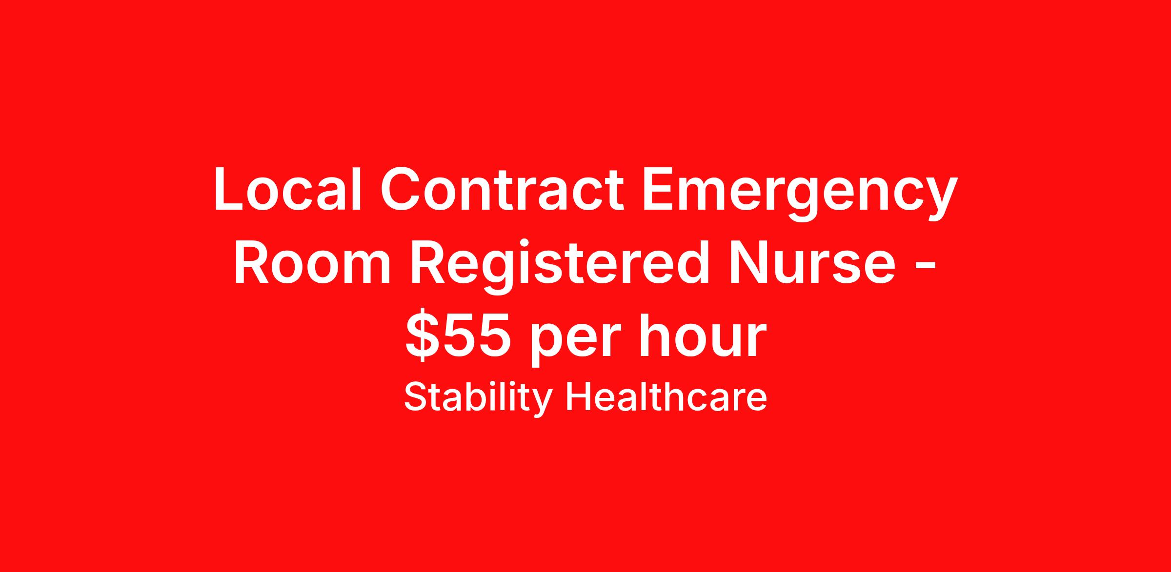 Stability Healthcare is seeking a local contract nurse RN ED - Emergency Department for a local contract nursing job in Meriden, Connecticut. Job Description & Requirements Specialty: ED - Emergency Department Discipline: RN Duration: 13 weeks 36 hours per week Shift: 12 hours, nights Employment Type: Local Contract Stability Healthcare is looking for a ER RN contract position in Meriden, CT. Emergency room (ER) nurses provide care for patients requiring emergency attention because of physical trauma or acute illness. ER nurses work to quickly assess the needs of each patient to avoid long-term complications, disabilities, or even death. *$600 travel bonus *Day 1 health insurance with United Healthcare *PTO plan start accruing on day 1, use during contract or cash out at the end! *Guaranteed stipend if facility calls you off *Extra hour bonus earn an additional hourly bonus for working over your weekly contracted hours Stability Job ID L-827152. Pay package is based on 12 hour shifts and 36 hours per week (subject to confirmation) with tax-free stipend amount to be determined. Posted job title: ER About Stability Healthcare Stability Healthcare was founded in 2009, with the mission of becoming the best Travel Nursing Agency in California. We have been rated one of the top travel nursing agencies and offer our nurses the highest paying travel nursing jobs available. We have access to the best travel assignments from 1000’s of facilities. You can start the year off in sunny California, spend the Spring in the Colorado Rockies, enjoy the Summer in the Mid-West, experience the change of seasons in Boston and New York, and hit the beaches of Florida in the winter. Our Nurses work in the best hospitals and health systems in the country. Benefits Guaranteed Hours Benefits start day 1