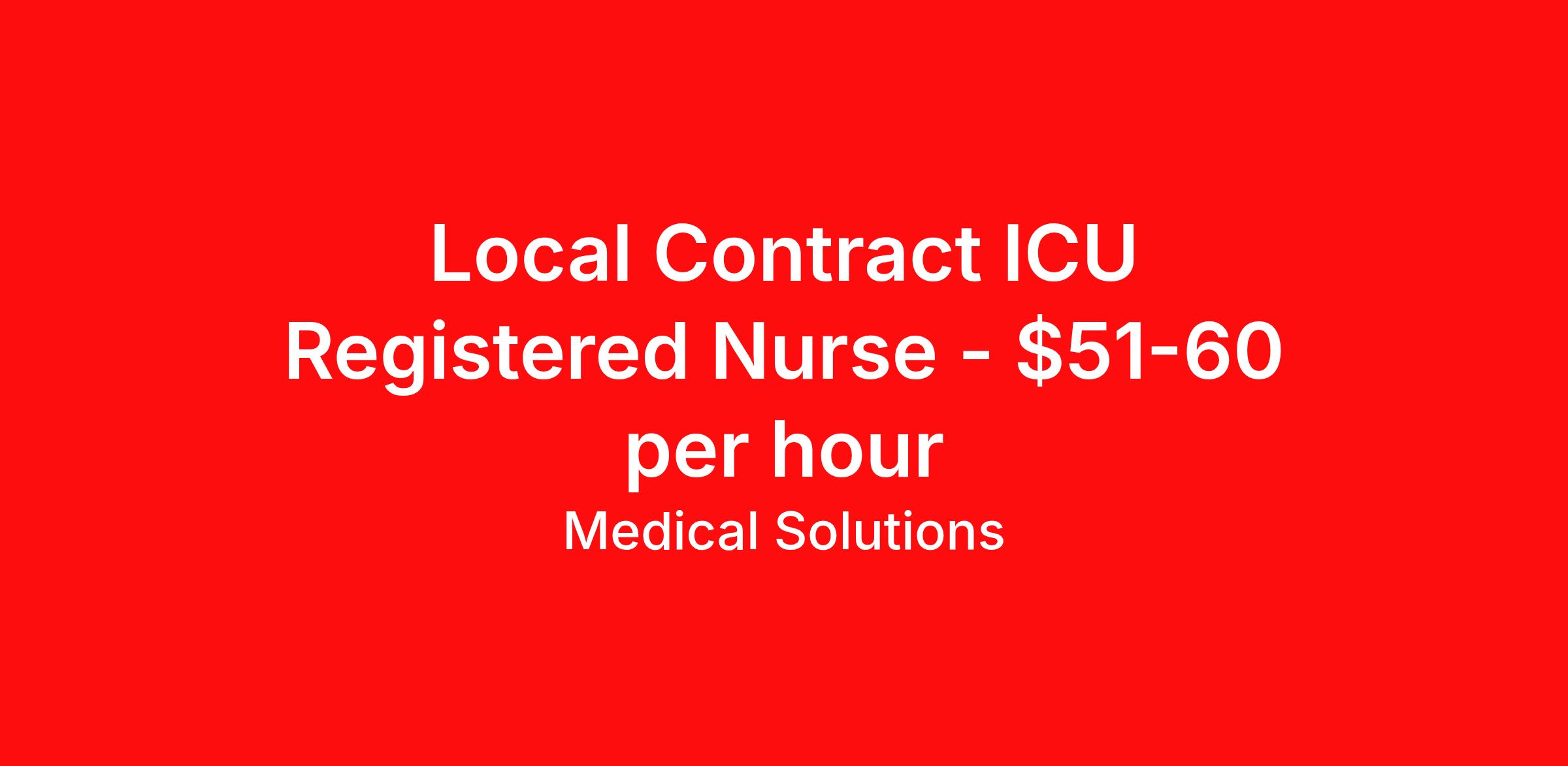 Medical Solutions is seeking a local contract nurse RN ICU - Intensive Care Unit for a local contract nursing job in Sonora, California. Job Description & Requirements Specialty: ICU - Intensive Care Unit Discipline: RN Duration: 13 weeks 36 hours per week Shift: 12 hours, nights Employment Type: Local Contract We’re seeking talented healthcare professionals whose adventure game is as strong as their clinical game. Those that want flexibility and high pay, we have the positions for you! Some of the industry-leading benefits enjoyed by Medical Solutions travel nurses and travel allied healthcare professionals include: Day One Medical, Dental, and Vision with low premiums Day One 401(k) with Company Contribution Personalized Compensation Packages Paid, Private, Fully Furnished, Pet-Friendly Housing Dedicated Recruiter and 24/7 Customer Care Line Per Diem Allowance and Paid Travel Licensure and Certification Reimbursement Free Liability Coverage Voluntary Benefits: Critical Illness, Hospital Indemnity, Accident, and Pet Insurance Equal Employment Opportunity And More! Estimated pay package based on bill rate at time job was posted. Bill rates can change frequently and without notice. Exact pay package may vary based on guaranteed hours, distance being traveled, and customizations available for travelers. Hospital in California is seeking a travel ICU nurse. Must have 2 years experience with ACLS, BLS, and PALS. Contact Medical Solutions for more information at Medical Solutions Job ID 1068397L. Posted job title: ICU (Intensive Care Unit) About Medical Solutions At Medical Solutions, we’re people who care, helping people who care. No matter how you look at it, there’s a whole lot of care going on in our world and that’s just the way we like it. What do we do? Medical Solutions is one of the nation’s largest providers of total workforce solutions in the healthcare industry, connecting nurses and allied health clinicians with hospitals and healthcare systems across the country and around the corner. Through our family of brands, we also serve a segment of clients outside of the healthcare space. And we’re the very best at what we do. You’ll love our culture that’s filled with heart and soul. As a company and employer, we’re sincerely and unabashedly us. We lead as humans first and believe the unique qualities of each team member make us better together. We share a purpose for helping others and the drive to make a difference. And we offer endless opportunities for personal and professional growth, throughout your career. At Medical Solutions, you’ll find a great place to work and a career home. We’ve received Best Places to Work awards, landed top industry awards, and received accolades for the impact we’ve made in business and within our community. But the only way to really get to know us, is to join us. We think you’ll fit right in. Benefits Weekly pay Holiday Pay Guaranteed Hours Continuing Education 401k retirement plan Pet insurance Company provided housing options Cancelation protection Wellness and fitness programs Mileage reimbursement Referral bonus Employee assistance programs Medical benefits Dental benefits Vision benefits Benefits start day 1 License and certification reimbursement Life insurance Discount program