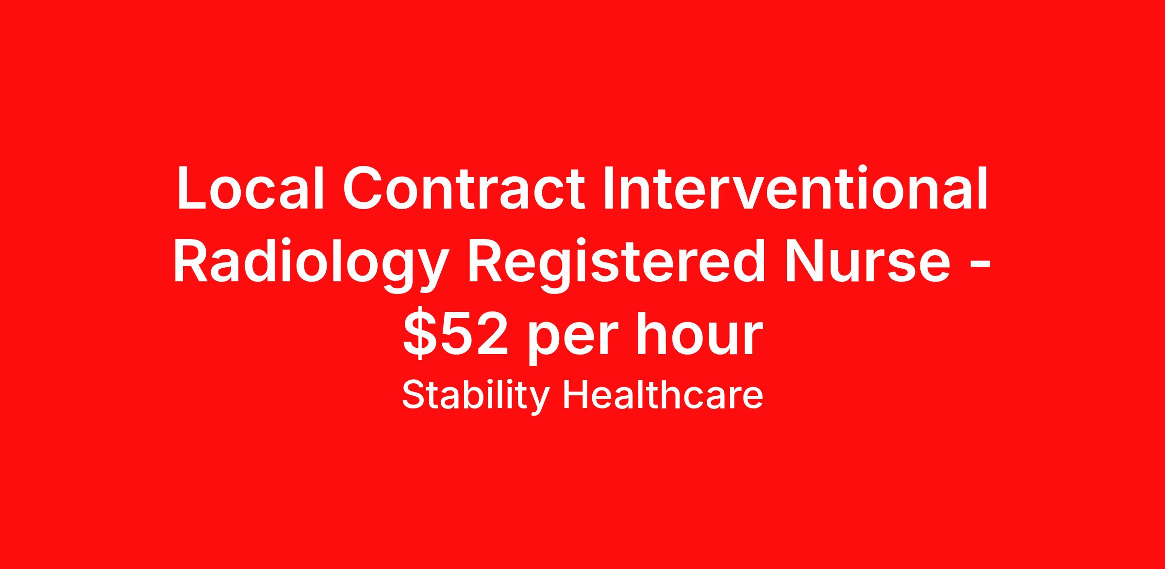 Stability Healthcare is seeking a local contract nurse RN Interventional Radiology for a local contract nursing job in Charleston, West Virginia. Job Description & Requirements Specialty: Interventional Radiology Discipline: RN Start Date: 04/16/2026 Duration: 13 weeks 40 hours per week Shift: 10 hours, days Employment Type: Local Contract Stability Healthcare is looking for a Interventional Radiology RN contract position in Charleston, WV. The main goal of radiology nurses is patient safety. They monitor and assess patients, provide education to the patient and family members, ensure the patient and family members understand the procedure and plan of care, Insert and remove intravenous lines, administer conscious sedation drugs and other drugs, monitor patient patterns and vital signs during the procedure, and oversee the safety and comfort of patients before, during, and after procedures. *$600 travel bonus *Day 1 health insurance with United Healthcare *PTO plan start accruing on day 1, use during contract or cash out at the end! *Guaranteed stipend if facility calls you off *Extra hour bonus earn an additional hourly bonus for working over your weekly contracted hours Stability Job ID L-826306. Pay package is based on 10 hour shifts and 40 hours per week (subject to confirmation) with tax-free stipend amount to be determined. Posted job title: Interventional Radiology About Stability Healthcare Stability Healthcare was founded in 2009, with the mission of becoming the best Travel Nursing Agency in California. We have been rated one of the top travel nursing agencies and offer our nurses the highest paying travel nursing jobs available. We have access to the best travel assignments from 1000’s of facilities. You can start the year off in sunny California, spend the Spring in the Colorado Rockies, enjoy the Summer in the Mid-West, experience the change of seasons in Boston and New York, and hit the beaches of Florida in the winter. Our Nurses work in the best hospitals and health systems in the country. Benefits Guaranteed Hours Benefits start day 1