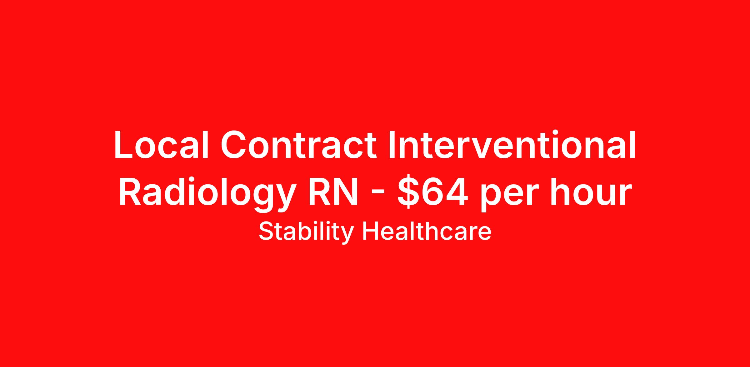 Stability Healthcare is seeking a local contract nurse RN Interventional Radiology for a local contract nursing job in Wausau, Wisconsin. Job Description & Requirements Specialty: Interventional Radiology Discipline: RN Duration: 13 weeks 40 hours per week Shift: 8 hours, days Employment Type: Local Contract Stability Healthcare is looking for a Interventional Radiology RN contract position in Wausau, WI. The main goal of radiology nurses is patient safety. They monitor and assess patients, provide education to the patient and family members, ensure the patient and family members understand the procedure and plan of care, Insert and remove intravenous lines, administer conscious sedation drugs and other drugs, monitor patient patterns and vital signs during the procedure, and oversee the safety and comfort of patients before, during, and after procedures. *$600 travel bonus *Day 1 health insurance with United Healthcare *PTO plan start accruing on day 1, use during contract or cash out at the end! *Guaranteed stipend if facility calls you off *Extra hour bonus earn an additional hourly bonus for working over your weekly contracted hours Stability Job ID L-824371. Pay package is based on 8 hour shifts and 40 hours per week (subject to confirmation) with tax-free stipend amount to be determined. Posted job title: Interventional Radiology About Stability Healthcare Stability Healthcare was founded in 2009, with the mission of becoming the best Travel Nursing Agency in California. We have been rated one of the top travel nursing agencies and offer our nurses the highest paying travel nursing jobs available. We have access to the best travel assignments from 1000’s of facilities. You can start the year off in sunny California, spend the Spring in the Colorado Rockies, enjoy the Summer in the Mid-West, experience the change of seasons in Boston and New York, and hit the beaches of Florida in the winter. Our Nurses work in the best hospitals and health systems in the country. Benefits Guaranteed Hours Benefits start day 1