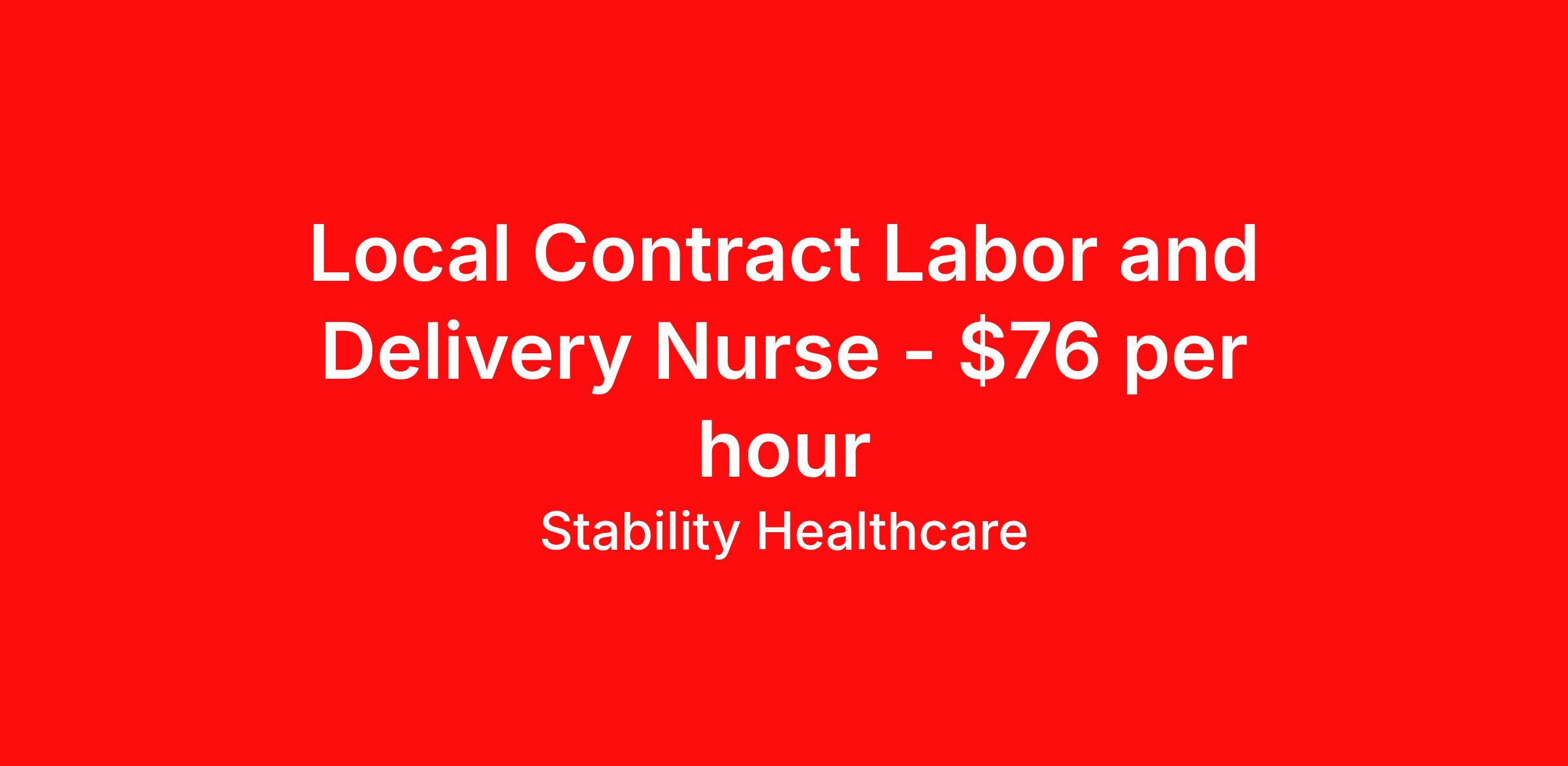 Stability Healthcare is seeking a local contract nurse RN Labor and Delivery for a local contract nursing job in Santa Rosa, California. Job Description & Requirements Specialty: Labor and Delivery Discipline: RN Duration: 13 weeks 36 hours per week Shift: 12 hours, nights Employment Type: Local Contract Stability Healthcare is looking for a L&D RN contract position in Santa Rosa, CA. Labor and Delivery (L&D) Nurses care for women during labor and childbirth, monitoring the baby and the mother, coaching mothers and assisting doctors. As a L&D Nurse, you'll prepare women, and their families, for the stages of giving birth and help patients with breastfeeding after the baby is born. *$600 travel bonus *Day 1 health insurance with United Healthcare *PTO plan start accruing on day 1, use during contract or cash out at the end! *Guaranteed stipend if facility calls you off *Extra hour bonus earn an additional hourly bonus for working over your weekly contracted hours Stability Job ID L-838176. Pay package is based on 12 hour shifts and 36 hours per week (subject to confirmation) with tax-free stipend amount to be determined. Posted job title: L&D About Stability Healthcare Stability Healthcare was founded in 2009, with the mission of becoming the best Travel Nursing Agency in California. We have been rated one of the top travel nursing agencies and offer our nurses the highest paying travel nursing jobs available. We have access to the best travel assignments from 1000’s of facilities. You can start the year off in sunny California, spend the Spring in the Colorado Rockies, enjoy the Summer in the Mid-West, experience the change of seasons in Boston and New York, and hit the beaches of Florida in the winter. Our Nurses work in the best hospitals and health systems in the country. Benefits Guaranteed Hours Benefits start day 1