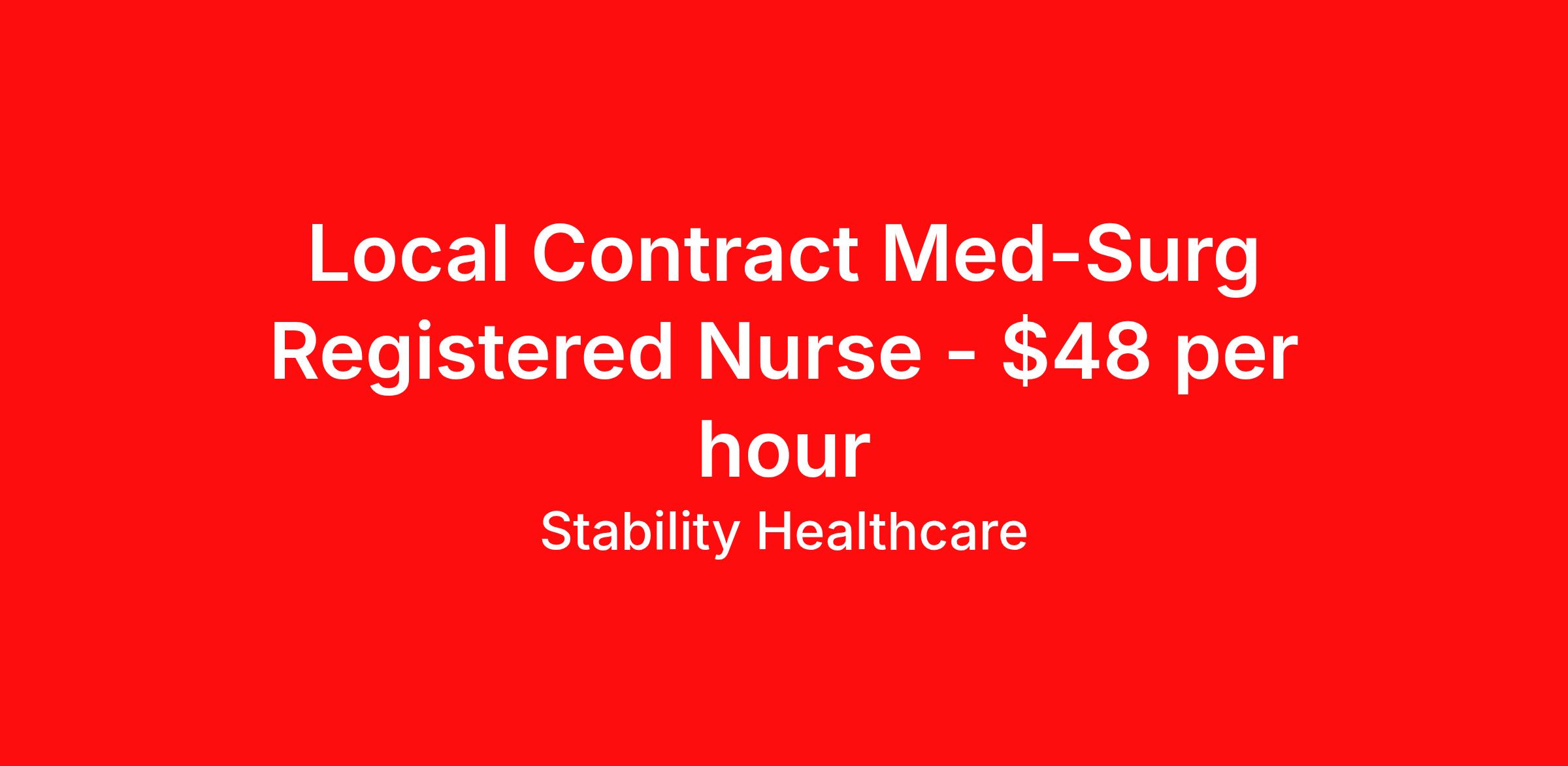 Stability Healthcare is seeking a local contract nurse RN Med Surg for a local contract nursing job in Reading, Pennsylvania. Job Description & Requirements Specialty: Med Surg Discipline: RN Duration: 13 weeks 36 hours per week Shift: 12 hours, days Employment Type: Local Contract Stability Healthcare is looking for a Med-Surg RN contract position in Reading, PA. The majority of hospitalized patients are admitted to M/S either directly or after surgery. M/S is also where patients who have been in critical care (ICU) are transferred when they no longer need critical care but still require nursing care. *$600 travel bonus *Day 1 health insurance with United Healthcare *PTO plan start accruing on day 1, use during contract or cash out at the end! *Guaranteed stipend if facility calls you off *Extra hour bonus earn an additional hourly bonus for working over your weekly contracted hours Stability Job ID L-825088. Pay package is based on 12 hour shifts and 36 hours per week (subject to confirmation) with tax-free stipend amount to be determined. Posted job title: Med-Surg About Stability Healthcare Stability Healthcare was founded in 2009, with the mission of becoming the best Travel Nursing Agency in California. We have been rated one of the top travel nursing agencies and offer our nurses the highest paying travel nursing jobs available. We have access to the best travel assignments from 1000’s of facilities. You can start the year off in sunny California, spend the Spring in the Colorado Rockies, enjoy the Summer in the Mid-West, experience the change of seasons in Boston and New York, and hit the beaches of Florida in the winter. Our Nurses work in the best hospitals and health systems in the country. Benefits Guaranteed Hours Benefits start day 1