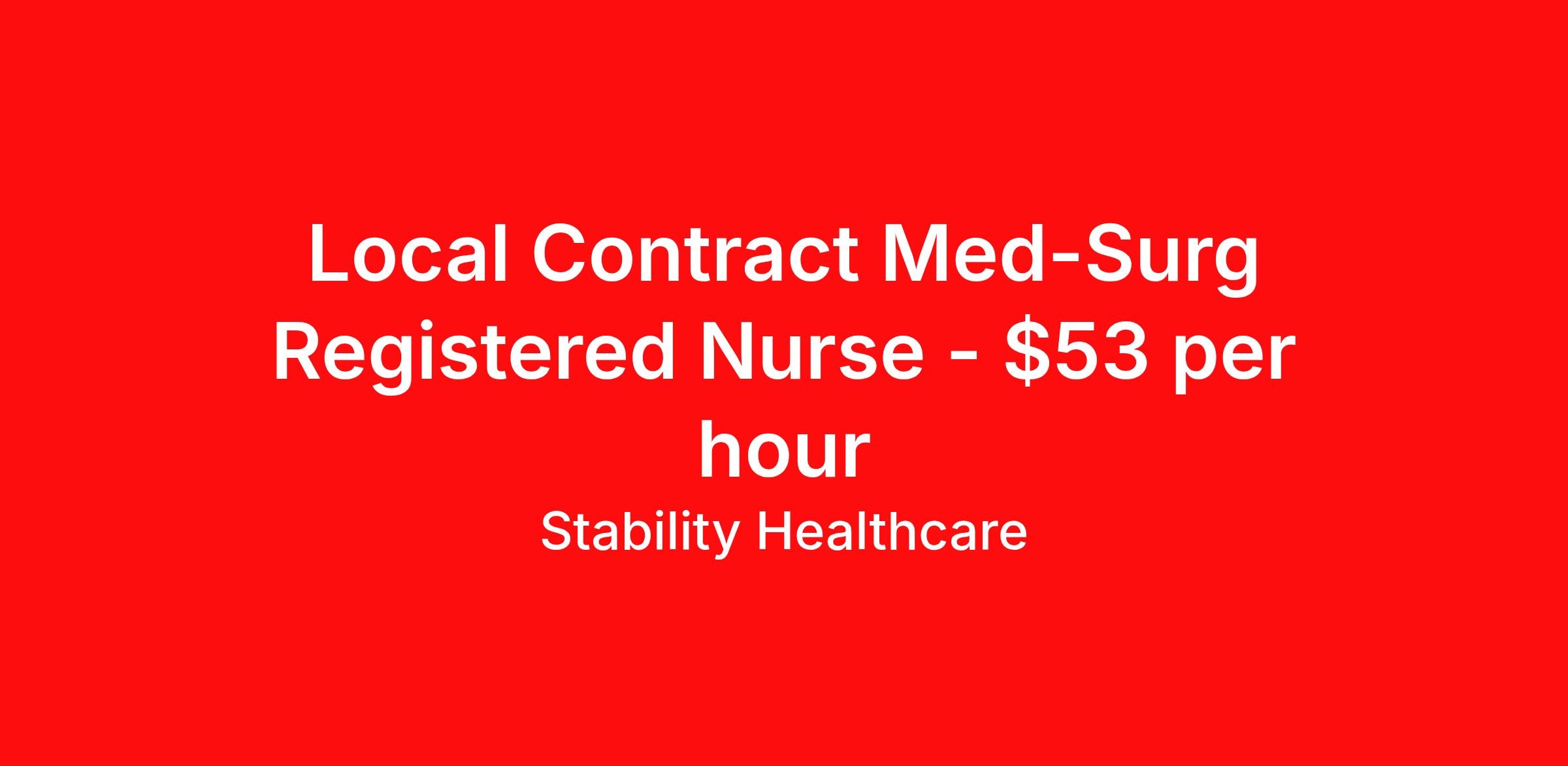 Stability Healthcare is seeking a local contract nurse RN Med Surg for a local contract nursing job in Geneva, New York. Job Description & Requirements Specialty: Med Surg Discipline: RN Start Date: 04/13/2026 Duration: 14 weeks 36 hours per week Shift: 12 hours Employment Type: Local Contract Stability Healthcare is looking for a Med-Surg RN contract position in Geneva, NY. The majority of hospitalized patients are admitted to M/S either directly or after surgery. M/S is also where patients who have been in critical care (ICU) are transferred when they no longer need critical care but still require nursing care. *$600 travel bonus *Day 1 health insurance with United Healthcare *PTO plan start accruing on day 1, use during contract or cash out at the end! *Guaranteed stipend if facility calls you off *Extra hour bonus earn an additional hourly bonus for working over your weekly contracted hours Stability Job ID L-827829. Pay package is based on 12 hour shifts and 36 hours per week (subject to confirmation) with tax-free stipend amount to be determined. Posted job title: Med-Surg About Stability Healthcare Stability Healthcare was founded in 2009, with the mission of becoming the best Travel Nursing Agency in California. We have been rated one of the top travel nursing agencies and offer our nurses the highest paying travel nursing jobs available. We have access to the best travel assignments from 1000’s of facilities. You can start the year off in sunny California, spend the Spring in the Colorado Rockies, enjoy the Summer in the Mid-West, experience the change of seasons in Boston and New York, and hit the beaches of Florida in the winter. Our Nurses work in the best hospitals and health systems in the country. Benefits Guaranteed Hours Benefits start day 1