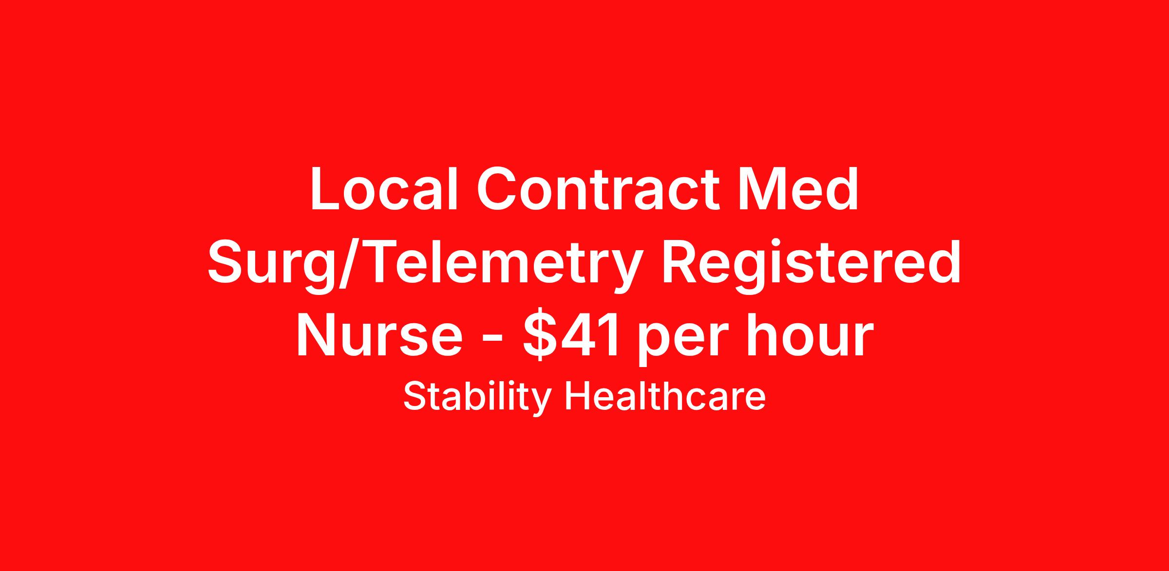 Stability Healthcare is seeking a local contract nurse RN Med Surg / Telemetry for a local contract nursing job in Albany, New York. Job Description & Requirements Specialty: Med Surg / Telemetry Discipline: RN Duration: 13 weeks 36 hours per week Shift: 12 hours, nights Employment Type: Local Contract Stability Healthcare is looking for a Med-Surg RN contract position in Albany, NY. The majority of hospitalized patients are admitted to M/S either directly or after surgery. M/S is also where patients who have been in critical care (ICU) are transferred when they no longer need critical care but still require nursing care. *$600 travel bonus *Day 1 health insurance with United Healthcare *PTO plan start accruing on day 1, use during contract or cash out at the end! *Guaranteed stipend if facility calls you off *Extra hour bonus earn an additional hourly bonus for working over your weekly contracted hours Stability Job ID L-821403. Pay package is based on 12 hour shifts and 36 hours per week (subject to confirmation) with tax-free stipend amount to be determined. Posted job title: Med-Surg About Stability Healthcare Stability Healthcare was founded in 2009, with the mission of becoming the best Travel Nursing Agency in California. We have been rated one of the top travel nursing agencies and offer our nurses the highest paying travel nursing jobs available. We have access to the best travel assignments from 1000’s of facilities. You can start the year off in sunny California, spend the Spring in the Colorado Rockies, enjoy the Summer in the Mid-West, experience the change of seasons in Boston and New York, and hit the beaches of Florida in the winter. Our Nurses work in the best hospitals and health systems in the country. Benefits Guaranteed Hours Benefits start day 1