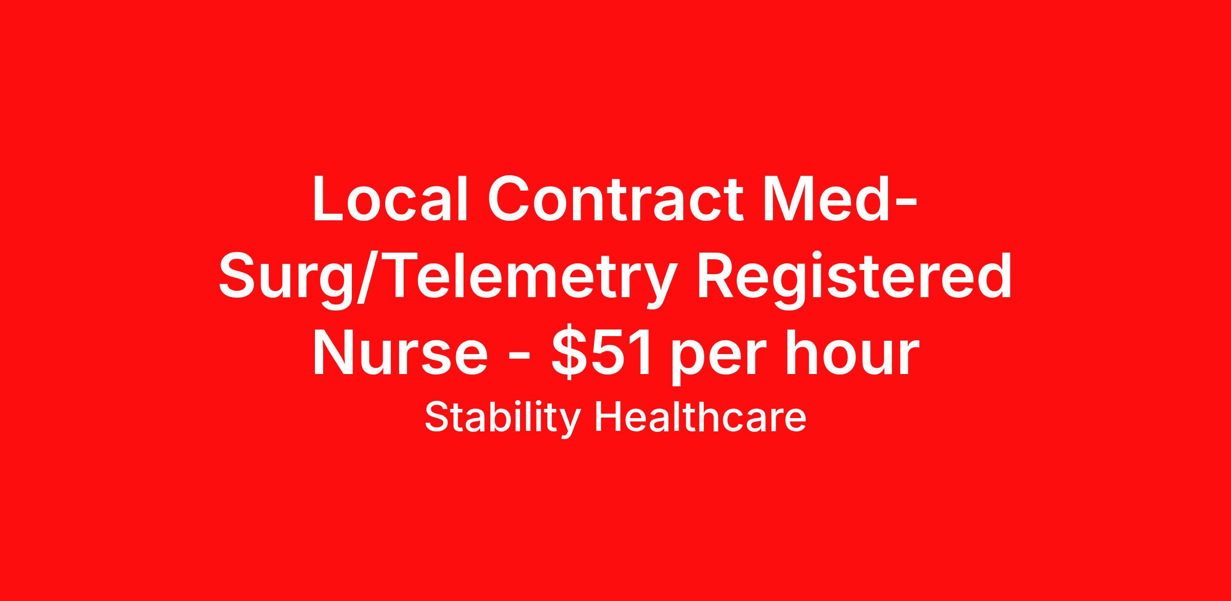 Stability Healthcare is seeking a local contract nurse RN Med Surg / Telemetry for a local contract nursing job in Massena, New York. Job Description & Requirements Specialty: Med Surg / Telemetry Discipline: RN Start Date: 04/13/2026 Duration: 13 weeks 36 hours per week Shift: 12 hours, days Employment Type: Local Contract Stability Healthcare is looking for a Tele Med-Surg RN contract position in Massena, NY. The Medical Surgical Telemetry Registered Nurse (RN) provides direct nursing care in accordance with established policies, procedures and protocols of the healthcare organization often specializing in Neuro, Ortho or Cardiac patients. *$600 travel bonus *Day 1 health insurance with United Healthcare *PTO plan start accruing on day 1, use during contract or cash out at the end! *Guaranteed stipend if facility calls you off *Extra hour bonus earn an additional hourly bonus for working over your weekly contracted hours Stability Job ID L-823926. Pay package is based on 12 hour shifts and 36 hours per week (subject to confirmation) with tax-free stipend amount to be determined. Posted job title: Tele Med-Surg About Stability Healthcare Stability Healthcare was founded in 2009, with the mission of becoming the best Travel Nursing Agency in California. We have been rated one of the top travel nursing agencies and offer our nurses the highest paying travel nursing jobs available. We have access to the best travel assignments from 1000’s of facilities. You can start the year off in sunny California, spend the Spring in the Colorado Rockies, enjoy the Summer in the Mid-West, experience the change of seasons in Boston and New York, and hit the beaches of Florida in the winter. Our Nurses work in the best hospitals and health systems in the country. Benefits Guaranteed Hours Benefits start day 1