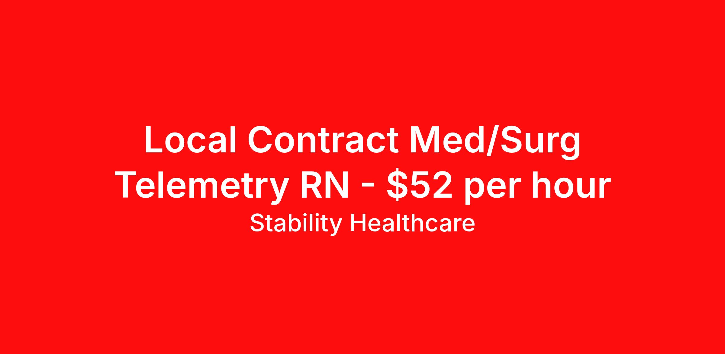 Stability Healthcare is seeking a local contract nurse RN Med Surg / Telemetry for a local contract nursing job in Canton, Ohio. Job Description & Requirements Specialty: Med Surg / Telemetry Discipline: RN Start Date: 04/17/2026 Duration: 13 weeks 36 hours per week Shift: 12 hours, nights Employment Type: Local Contract Stability Healthcare is looking for a Tele Med-Surg RN contract position in Canton, OH. The Medical Surgical Telemetry Registered Nurse (RN) provides direct nursing care in accordance with established policies, procedures and protocols of the healthcare organization often specializing in Neuro, Ortho or Cardiac patients. *$600 travel bonus *Day 1 health insurance with United Healthcare *PTO plan start accruing on day 1, use during contract or cash out at the end! *Guaranteed stipend if facility calls you off *Extra hour bonus earn an additional hourly bonus for working over your weekly contracted hours Stability Job ID L-826673. Pay package is based on 12 hour shifts and 36 hours per week (subject to confirmation) with tax-free stipend amount to be determined. Posted job title: Tele Med-Surg About Stability Healthcare Stability Healthcare was founded in 2009, with the mission of becoming the best Travel Nursing Agency in California. We have been rated one of the top travel nursing agencies and offer our nurses the highest paying travel nursing jobs available. We have access to the best travel assignments from 1000’s of facilities. You can start the year off in sunny California, spend the Spring in the Colorado Rockies, enjoy the Summer in the Mid-West, experience the change of seasons in Boston and New York, and hit the beaches of Florida in the winter. Our Nurses work in the best hospitals and health systems in the country. Benefits Guaranteed Hours Benefits start day 1