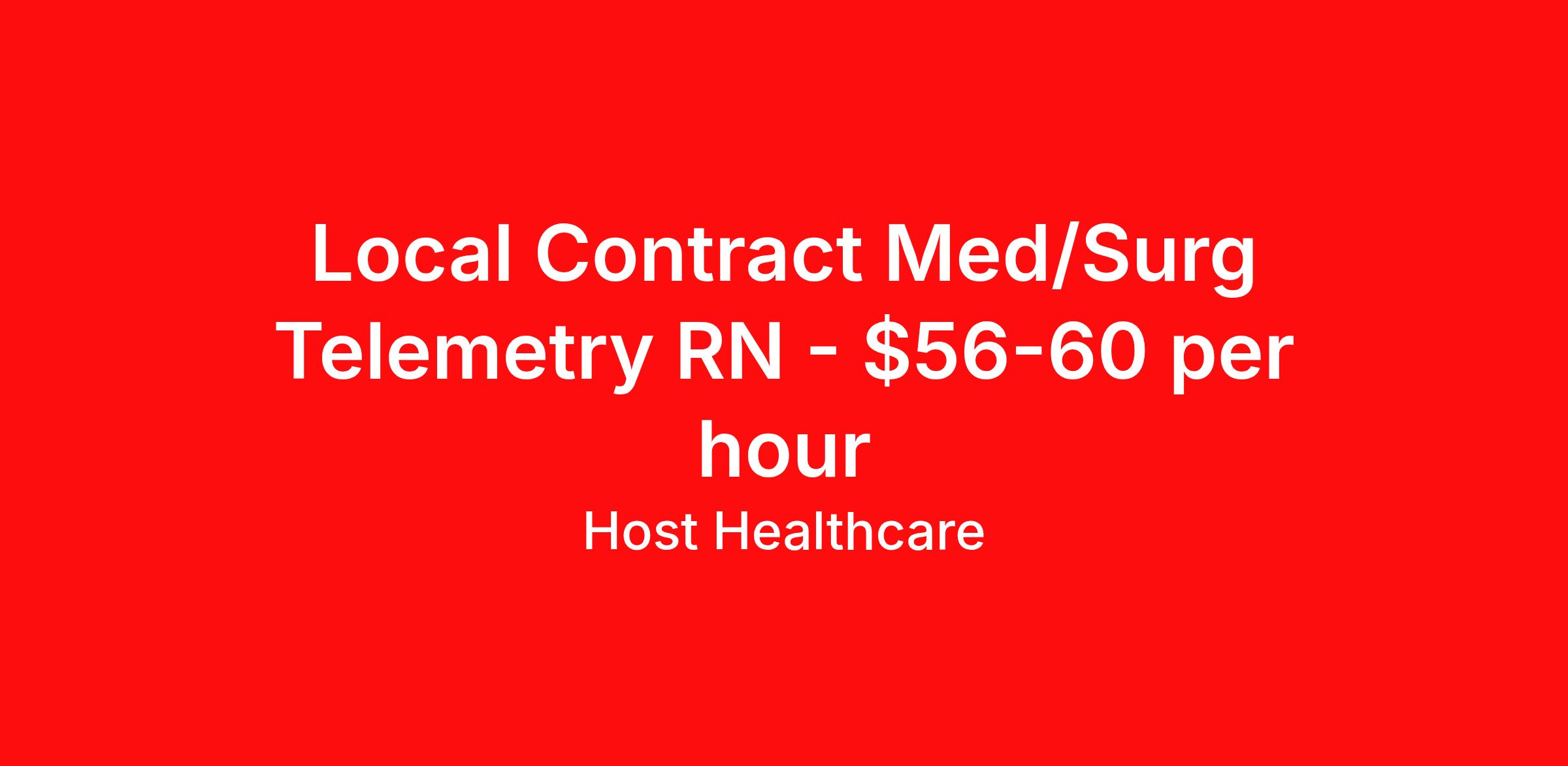 Host Healthcare is seeking a local contract nurse RN Telemetry Med Surg for a local contract nursing job in Cleveland, Ohio. Job Description & Requirements Specialty: Telemetry Discipline: RN Start Date: 04/17/2026 Duration: 13 weeks 36 hours per week Shift: 12 hours, days Employment Type: Local Contract Host Healthcare Job ID La1fVX000002sXU5YAM. Pay package is based on 12 hour shifts and 36 hours per week (subject to confirmation) with tax-free stipend amount to be determined. Posted job title: RN - Telemetry About Host Healthcare At Host Healthcare, we provide a truly comfortable experience as you explore your travel nursing, therapy, or allied career. We make your travel healthcare journey easy by taking care of all the details, so you don’t have to. We are on a mission to help others live better and we do this by helping the healers of the world be as comfortable as possible. With access to tens of thousands of travel nursing, therapy, and allied jobs in all 50 states, our responsive and friendly recruiters find your dream position based on what’s important to you. During your assignment, get access to premium benefits, including Day 1 medical that continues up to 30 days between assignments, 401K matching, travel reimbursements, dedicated housing support, and more. We also offer 24/7 support from our team and access to our on-staff clinicians so you can feel comfortable and confident throughout your entire assignment. Travel comfortably with Host Healthcare. Benefits Referral bonus School loan reimbursement Vision benefits Wellness and fitness programs Company provided housing options License and certification reimbursement Life insurance Medical benefits Mileage reimbursement Pet insurance Discount program Employee assistance programs Guaranteed Hours Health savings account Holiday Pay 401k retirement plan Continuing Education Dental benefits