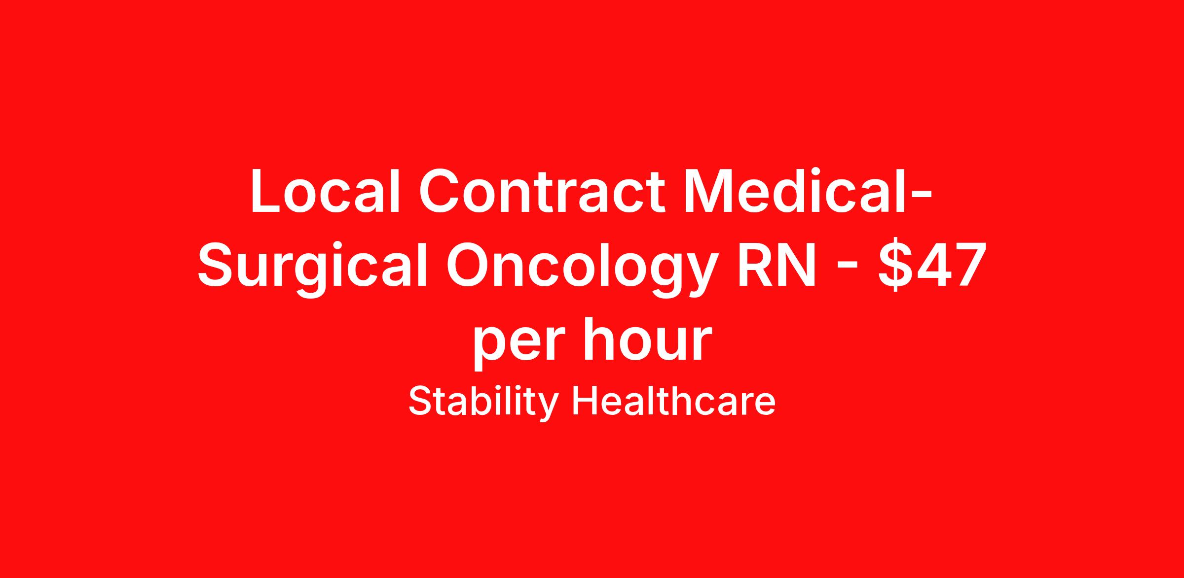 Stability Healthcare is seeking a local contract nurse RN Med Surg for a local contract nursing job in Wilmington, North Carolina. Job Description & Requirements Specialty: Med Surg Discipline: RN Duration: 13 weeks 36 hours per week Shift: 12 hours, nights Employment Type: Local Contract Stability Healthcare is looking for a Oncology RN contract position in Wilmington, NC. Oncology Nurses care for cancer patients of all ages. Oncology is one of the most challenging fields in nursing requiring high level of compassion to support and care for patients and their loved ones. Helping individuals through challenges on their cancer journey also makes Oncology one of the most rewarding professions. *$600 travel bonus *Day 1 health insurance with United Healthcare *PTO plan start accruing on day 1, use during contract or cash out at the end! *Guaranteed stipend if facility calls you off *Extra hour bonus earn an additional hourly bonus for working over your weekly contracted hours Stability Job ID L-822721. Pay package is based on 12 hour shifts and 36 hours per week (subject to confirmation) with tax-free stipend amount to be determined. Posted job title: Oncology About Stability Healthcare Stability Healthcare was founded in 2009, with the mission of becoming the best Travel Nursing Agency in California. We have been rated one of the top travel nursing agencies and offer our nurses the highest paying travel nursing jobs available. We have access to the best travel assignments from 1000’s of facilities. You can start the year off in sunny California, spend the Spring in the Colorado Rockies, enjoy the Summer in the Mid-West, experience the change of seasons in Boston and New York, and hit the beaches of Florida in the winter. Our Nurses work in the best hospitals and health systems in the country. Benefits Guaranteed Hours Benefits start day 1