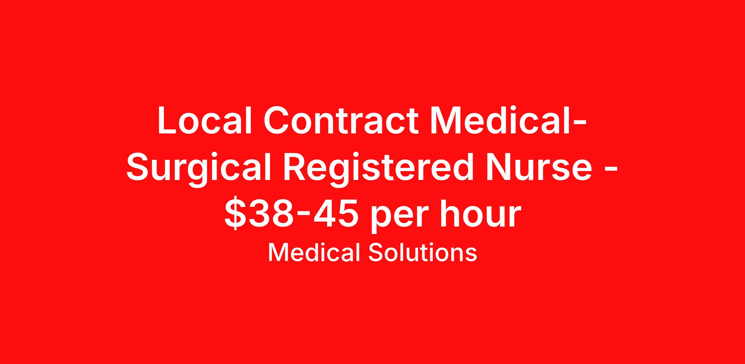 Medical Solutions is seeking a local contract nurse RN Med Surg for a local contract nursing job in Bloomington, Illinois. Job Description & Requirements Specialty: Med Surg Discipline: RN Duration: 13 weeks 36 hours per week Shift: 12 hours, days Employment Type: Local Contract We’re seeking talented healthcare professionals whose adventure game is as strong as their clinical game. Those that want flexibility and high pay, we have the positions for you! Some of the industry-leading benefits enjoyed by Medical Solutions travel nurses and travel allied healthcare professionals include: Day One Medical, Dental, and Vision with low premiums Day One 401(k) with Company Contribution Personalized Compensation Packages Paid, Private, Fully Furnished, Pet-Friendly Housing Dedicated Recruiter and 24/7 Customer Care Line Per Diem Allowance and Paid Travel Licensure and Certification Reimbursement Free Liability Coverage Voluntary Benefits: Critical Illness, Hospital Indemnity, Accident, and Pet Insurance Equal Employment Opportunity And More! Estimated pay package based on bill rate at time job was posted. Bill rates can change frequently and without notice. Exact pay package may vary based on guaranteed hours, distance being traveled, and customizations available for travelers. Medical Solutions Job ID 1075610L. Posted job title: Med Surg (Medical Surgical) About Medical Solutions At Medical Solutions, we’re people who care, helping people who care. No matter how you look at it, there’s a whole lot of care going on in our world and that’s just the way we like it. What do we do? Medical Solutions is one of the nation’s largest providers of total workforce solutions in the healthcare industry, connecting nurses and allied health clinicians with hospitals and healthcare systems across the country and around the corner. Through our family of brands, we also serve a segment of clients outside of the healthcare space. And we’re the very best at what we do. You’ll love our culture that’s filled with heart and soul. As a company and employer, we’re sincerely and unabashedly us. We lead as humans first and believe the unique qualities of each team member make us better together. We share a purpose for helping others and the drive to make a difference. And we offer endless opportunities for personal and professional growth, throughout your career. At Medical Solutions, you’ll find a great place to work and a career home. We’ve received Best Places to Work awards, landed top industry awards, and received accolades for the impact we’ve made in business and within our community. But the only way to really get to know us, is to join us. We think you’ll fit right in. Benefits Weekly pay Holiday Pay Guaranteed Hours Continuing Education 401k retirement plan Pet insurance Company provided housing options Cancelation protection Wellness and fitness programs Mileage reimbursement Referral bonus Employee assistance programs Medical benefits Dental benefits Vision benefits Benefits start day 1 License and certification reimbursement Life insurance Discount program