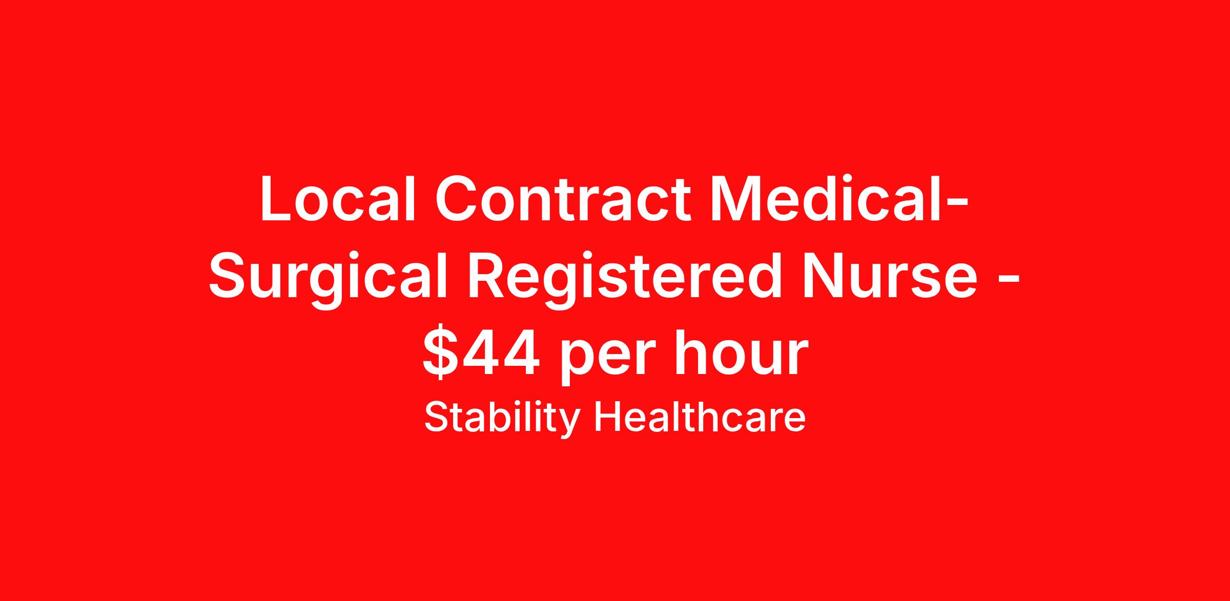 Stability Healthcare is seeking a local contract nurse RN Med Surg for a local contract nursing job in Saint Louis, Missouri. Job Description & Requirements Specialty: Med Surg Discipline: RN Duration: 13 weeks 36 hours per week Shift: 12 hours, days Employment Type: Local Contract Stability Healthcare is looking for a Med-Surg RN contract position in Saint Louis, MO. The majority of hospitalized patients are admitted to M/S either directly or after surgery. M/S is also where patients who have been in critical care (ICU) are transferred when they no longer need critical care but still require nursing care. *$600 travel bonus *Day 1 health insurance with United Healthcare *PTO plan start accruing on day 1, use during contract or cash out at the end! *Guaranteed stipend if facility calls you off *Extra hour bonus earn an additional hourly bonus for working over your weekly contracted hours Stability Job ID L-828331. Pay package is based on 12 hour shifts and 36 hours per week (subject to confirmation) with tax-free stipend amount to be determined. Posted job title: Med-Surg About Stability Healthcare Stability Healthcare was founded in 2009, with the mission of becoming the best Travel Nursing Agency in California. We have been rated one of the top travel nursing agencies and offer our nurses the highest paying travel nursing jobs available. We have access to the best travel assignments from 1000’s of facilities. You can start the year off in sunny California, spend the Spring in the Colorado Rockies, enjoy the Summer in the Mid-West, experience the change of seasons in Boston and New York, and hit the beaches of Florida in the winter. Our Nurses work in the best hospitals and health systems in the country. Benefits Guaranteed Hours Benefits start day 1