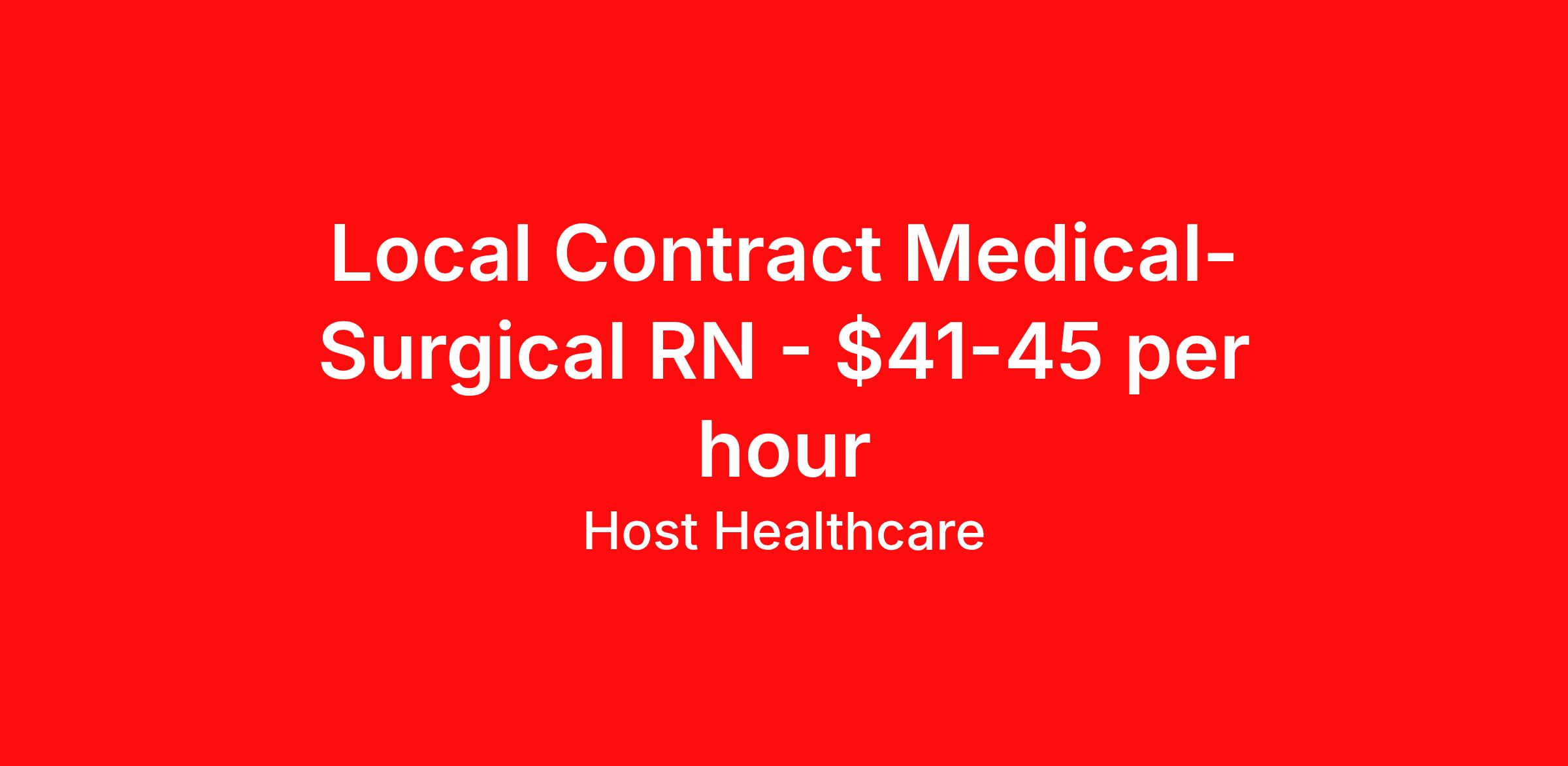 Host Healthcare is seeking a local contract nurse RN Med Surg for a local contract nursing job in Pratt, Kansas. Job Description & Requirements Specialty: Med Surg Discipline: RN Start Date: 03/30/2026 Duration: 13 weeks 36 hours per week Shift: 12 hours, nights Employment Type: Local Contract Host Healthcare Job ID La1fVX000002v6AnYAI. Pay package is based on 12 hour shifts and 36 hours per week (subject to confirmation) with tax-free stipend amount to be determined. Posted job title: RN - Medical-Surgical About Host Healthcare At Host Healthcare, we provide a truly comfortable experience as you explore your travel nursing, therapy, or allied career. We make your travel healthcare journey easy by taking care of all the details, so you don’t have to. We are on a mission to help others live better and we do this by helping the healers of the world be as comfortable as possible. With access to tens of thousands of travel nursing, therapy, and allied jobs in all 50 states, our responsive and friendly recruiters find your dream position based on what’s important to you. During your assignment, get access to premium benefits, including Day 1 medical that continues up to 30 days between assignments, 401K matching, travel reimbursements, dedicated housing support, and more. We also offer 24/7 support from our team and access to our on-staff clinicians so you can feel comfortable and confident throughout your entire assignment. Travel comfortably with Host Healthcare. Benefits Referral bonus School loan reimbursement Vision benefits Wellness and fitness programs Company provided housing options License and certification reimbursement Life insurance Medical benefits Mileage reimbursement Pet insurance Discount program Employee assistance programs Guaranteed Hours Health savings account Holiday Pay 401k retirement plan Continuing Education Dental benefits
