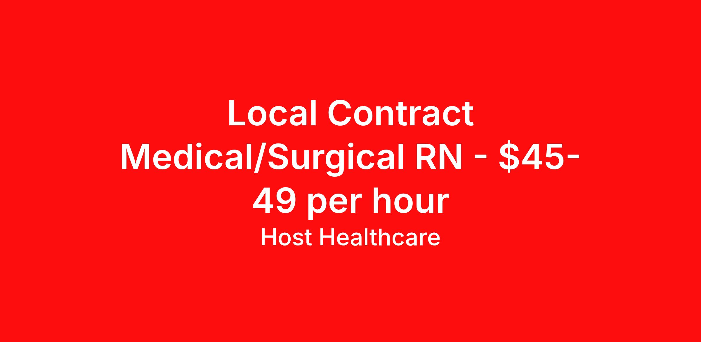 Host Healthcare is seeking a local contract nurse RN Med Surg for a local contract nursing job in Wichita, Kansas. Job Description & Requirements Specialty: Med Surg Discipline: RN Start Date: 04/19/2026 Duration: 13 weeks 48 hours per week Shift: 12 hours, nights Employment Type: Local Contract Host Healthcare Job ID La1fVX000002uwbFYAQ. Pay package is based on 12 hour shifts and 48 hours per week (subject to confirmation) with tax-free stipend amount to be determined. Posted job title: RN - Medical-Surgical About Host Healthcare At Host Healthcare, we provide a truly comfortable experience as you explore your travel nursing, therapy, or allied career. We make your travel healthcare journey easy by taking care of all the details, so you don’t have to. We are on a mission to help others live better and we do this by helping the healers of the world be as comfortable as possible. With access to tens of thousands of travel nursing, therapy, and allied jobs in all 50 states, our responsive and friendly recruiters find your dream position based on what’s important to you. During your assignment, get access to premium benefits, including Day 1 medical that continues up to 30 days between assignments, 401K matching, travel reimbursements, dedicated housing support, and more. We also offer 24/7 support from our team and access to our on-staff clinicians so you can feel comfortable and confident throughout your entire assignment. Travel comfortably with Host Healthcare. Benefits Referral bonus School loan reimbursement Vision benefits Wellness and fitness programs Company provided housing options License and certification reimbursement Life insurance Medical benefits Mileage reimbursement Pet insurance Discount program Employee assistance programs Guaranteed Hours Health savings account Holiday Pay 401k retirement plan Continuing Education Dental benefits