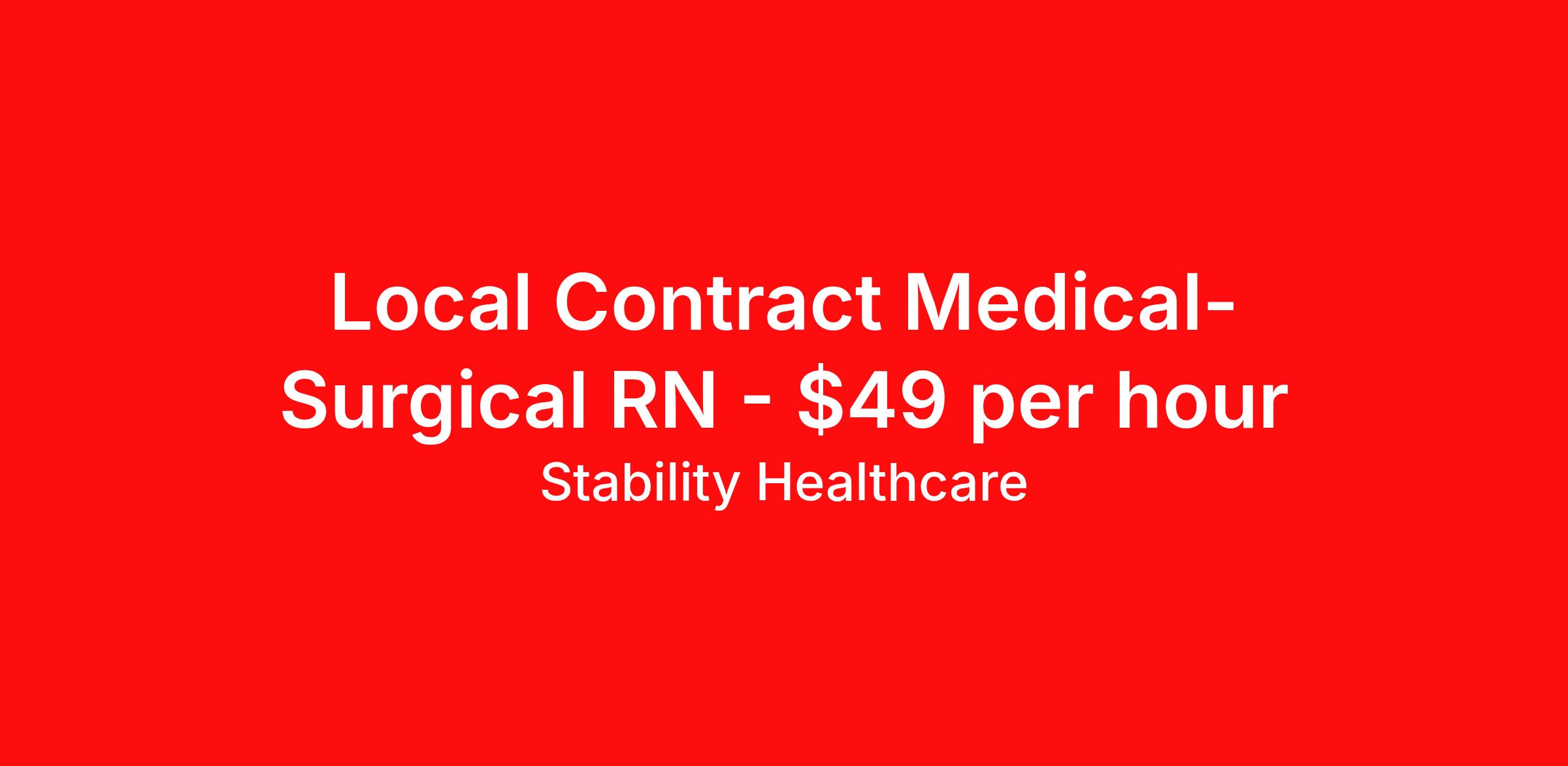 Stability Healthcare is seeking a local contract nurse RN Med Surg for a local contract nursing job in Phoenix, Arizona. Job Description & Requirements Specialty: Med Surg Discipline: RN Duration: 13 weeks 36 hours per week Shift: 12 hours, nights Employment Type: Local Contract Stability Healthcare is looking for a Med-Surg RN contract position in Phoenix, AZ. The majority of hospitalized patients are admitted to M/S either directly or after surgery. M/S is also where patients who have been in critical care (ICU) are transferred when they no longer need critical care but still require nursing care. *$600 travel bonus *Day 1 health insurance with United Healthcare *PTO plan start accruing on day 1, use during contract or cash out at the end! *Guaranteed stipend if facility calls you off *Extra hour bonus earn an additional hourly bonus for working over your weekly contracted hours Stability Job ID L-824028. Pay package is based on 12 hour shifts and 36 hours per week (subject to confirmation) with tax-free stipend amount to be determined. Posted job title: Med-Surg About Stability Healthcare Stability Healthcare was founded in 2009, with the mission of becoming the best Travel Nursing Agency in California. We have been rated one of the top travel nursing agencies and offer our nurses the highest paying travel nursing jobs available. We have access to the best travel assignments from 1000’s of facilities. You can start the year off in sunny California, spend the Spring in the Colorado Rockies, enjoy the Summer in the Mid-West, experience the change of seasons in Boston and New York, and hit the beaches of Florida in the winter. Our Nurses work in the best hospitals and health systems in the country. Benefits Guaranteed Hours Benefits start day 1