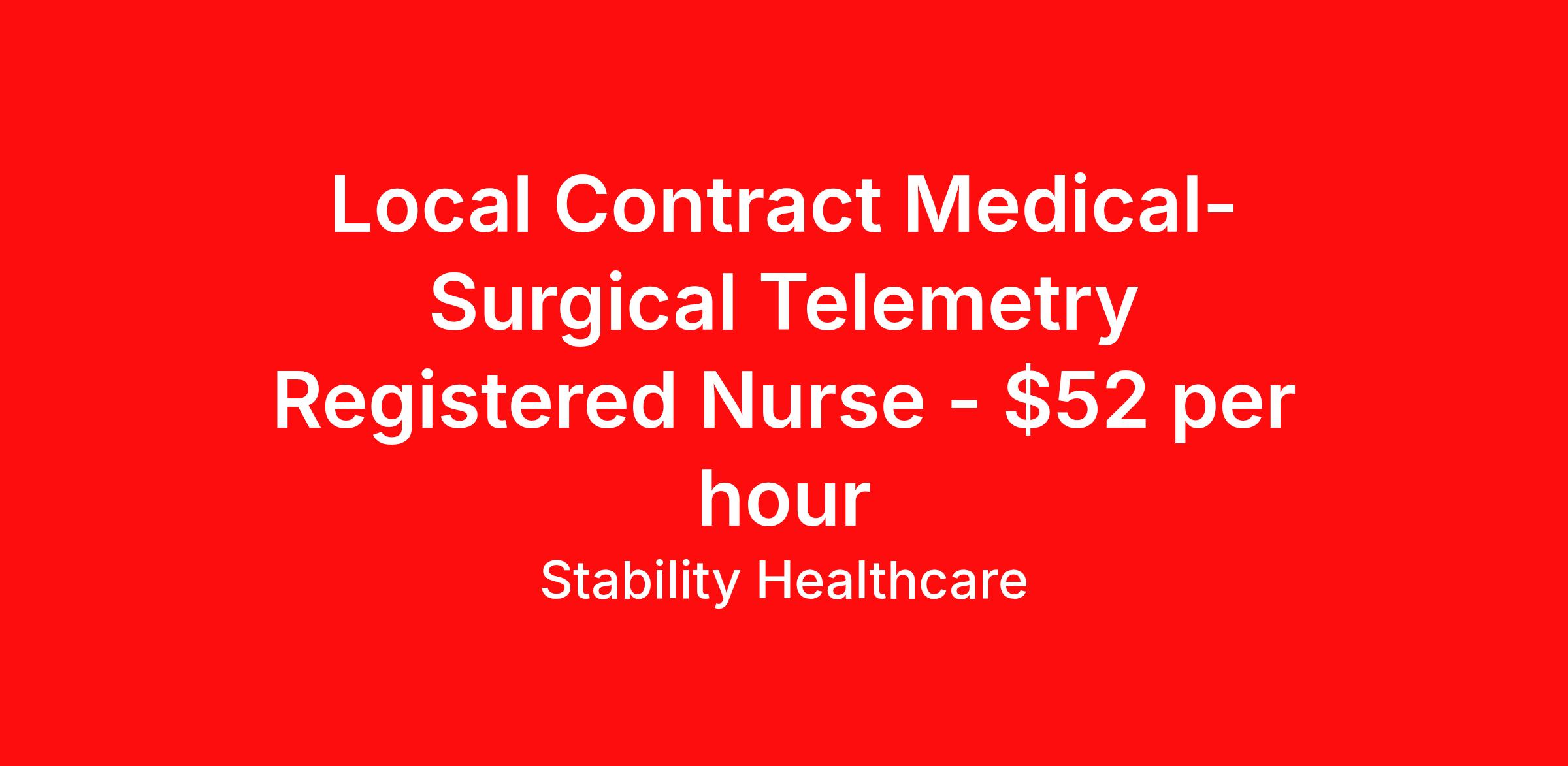 Stability Healthcare is seeking a local contract nurse RN Med Surg / Telemetry for a local contract nursing job in Lafayette, Louisiana. Job Description & Requirements Specialty: Med Surg / Telemetry Discipline: RN Duration: 8 weeks 36 hours per week Shift: 12 hours, nights Employment Type: Local Contract Stability Healthcare is looking for a Tele Med-Surg RN contract position in Lafayette, LA. The Medical Surgical Telemetry Registered Nurse (RN) provides direct nursing care in accordance with established policies, procedures and protocols of the healthcare organization often specializing in Neuro, Ortho or Cardiac patients. *$600 travel bonus *Day 1 health insurance with United Healthcare *PTO plan start accruing on day 1, use during contract or cash out at the end! *Guaranteed stipend if facility calls you off *Extra hour bonus earn an additional hourly bonus for working over your weekly contracted hours Stability Job ID L-828181. Pay package is based on 12 hour shifts and 36 hours per week (subject to confirmation) with tax-free stipend amount to be determined. Posted job title: Tele Med-Surg About Stability Healthcare Stability Healthcare was founded in 2009, with the mission of becoming the best Travel Nursing Agency in California. We have been rated one of the top travel nursing agencies and offer our nurses the highest paying travel nursing jobs available. We have access to the best travel assignments from 1000’s of facilities. You can start the year off in sunny California, spend the Spring in the Colorado Rockies, enjoy the Summer in the Mid-West, experience the change of seasons in Boston and New York, and hit the beaches of Florida in the winter. Our Nurses work in the best hospitals and health systems in the country. Benefits Guaranteed Hours Benefits start day 1