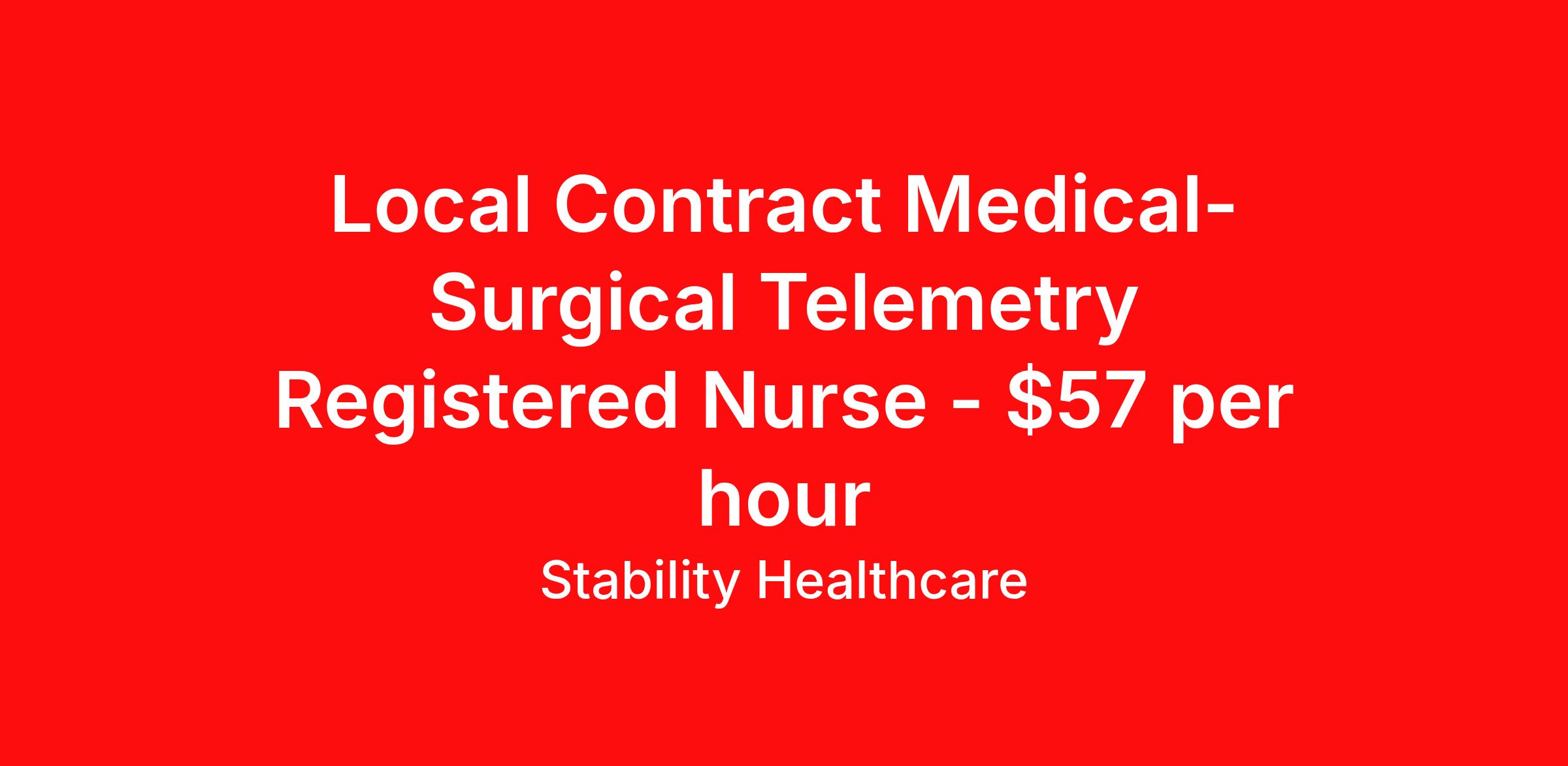 Stability Healthcare is seeking a local contract nurse RN Med Surg / Telemetry for a local contract nursing job in Madison, Wisconsin. Job Description & Requirements Specialty: Med Surg / Telemetry Discipline: RN Duration: 13 weeks 36 hours per week Shift: 12 hours Employment Type: Local Contract Stability Healthcare is looking for a Tele Med-Surg RN contract position in Madison, WI. The Medical Surgical Telemetry Registered Nurse (RN) provides direct nursing care in accordance with established policies, procedures and protocols of the healthcare organization often specializing in Neuro, Ortho or Cardiac patients. *$600 travel bonus *Day 1 health insurance with United Healthcare *PTO plan start accruing on day 1, use during contract or cash out at the end! *Guaranteed stipend if facility calls you off *Extra hour bonus earn an additional hourly bonus for working over your weekly contracted hours Stability Job ID L-826942. Pay package is based on 12 hour shifts and 36 hours per week (subject to confirmation) with tax-free stipend amount to be determined. Posted job title: Tele Med-Surg About Stability Healthcare Stability Healthcare was founded in 2009, with the mission of becoming the best Travel Nursing Agency in California. We have been rated one of the top travel nursing agencies and offer our nurses the highest paying travel nursing jobs available. We have access to the best travel assignments from 1000’s of facilities. You can start the year off in sunny California, spend the Spring in the Colorado Rockies, enjoy the Summer in the Mid-West, experience the change of seasons in Boston and New York, and hit the beaches of Florida in the winter. Our Nurses work in the best hospitals and health systems in the country. Benefits Guaranteed Hours Benefits start day 1