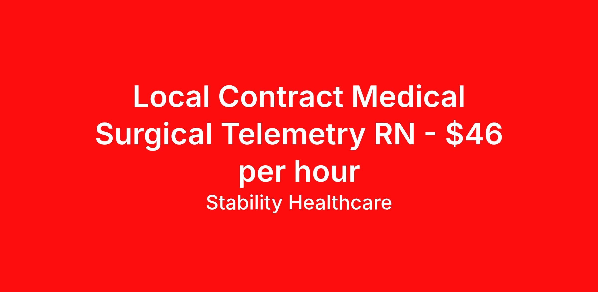 Stability Healthcare is seeking a local contract nurse RN Med Surg / Telemetry for a local contract nursing job in Morgantown, West Virginia. Job Description & Requirements Specialty: Med Surg / Telemetry Discipline: RN Duration: 13 weeks 48 hours per week Shift: 12 hours, nights Employment Type: Local Contract Stability Healthcare is looking for a Med-Surg RN contract position in Morgantown, WV. The majority of hospitalized patients are admitted to M/S either directly or after surgery. M/S is also where patients who have been in critical care (ICU) are transferred when they no longer need critical care but still require nursing care. *$600 travel bonus *Day 1 health insurance with United Healthcare *PTO plan start accruing on day 1, use during contract or cash out at the end! *Guaranteed stipend if facility calls you off *Extra hour bonus earn an additional hourly bonus for working over your weekly contracted hours Stability Job ID L-826339. Pay package is based on 12 hour shifts and 48 hours per week (subject to confirmation) with tax-free stipend amount to be determined. Posted job title: Med-Surg About Stability Healthcare Stability Healthcare was founded in 2009, with the mission of becoming the best Travel Nursing Agency in California. We have been rated one of the top travel nursing agencies and offer our nurses the highest paying travel nursing jobs available. We have access to the best travel assignments from 1000’s of facilities. You can start the year off in sunny California, spend the Spring in the Colorado Rockies, enjoy the Summer in the Mid-West, experience the change of seasons in Boston and New York, and hit the beaches of Florida in the winter. Our Nurses work in the best hospitals and health systems in the country. Benefits Guaranteed Hours Benefits start day 1