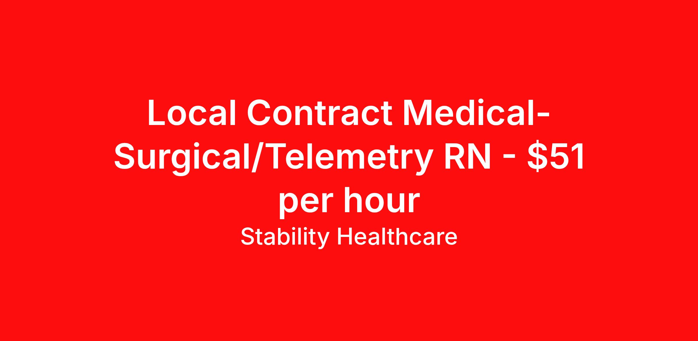 Stability Healthcare is seeking a local contract nurse RN Med Surg for a local contract nursing job in Poplar Bluff, Missouri. Job Description & Requirements Specialty: Med Surg Discipline: RN Duration: 13 weeks 36 hours per week Shift: 12 hours, nights Employment Type: Local Contract Stability Healthcare is looking for a Med-Surg RN contract position in Poplar Bluff, MO. The majority of hospitalized patients are admitted to M/S either directly or after surgery. M/S is also where patients who have been in critical care (ICU) are transferred when they no longer need critical care but still require nursing care. *$600 travel bonus *Day 1 health insurance with United Healthcare *PTO plan start accruing on day 1, use during contract or cash out at the end! *Guaranteed stipend if facility calls you off *Extra hour bonus earn an additional hourly bonus for working over your weekly contracted hours Stability Job ID L-823359. Pay package is based on 12 hour shifts and 36 hours per week (subject to confirmation) with tax-free stipend amount to be determined. Posted job title: Med-Surg About Stability Healthcare Stability Healthcare was founded in 2009, with the mission of becoming the best Travel Nursing Agency in California. We have been rated one of the top travel nursing agencies and offer our nurses the highest paying travel nursing jobs available. We have access to the best travel assignments from 1000’s of facilities. You can start the year off in sunny California, spend the Spring in the Colorado Rockies, enjoy the Summer in the Mid-West, experience the change of seasons in Boston and New York, and hit the beaches of Florida in the winter. Our Nurses work in the best hospitals and health systems in the country. Benefits Guaranteed Hours Benefits start day 1