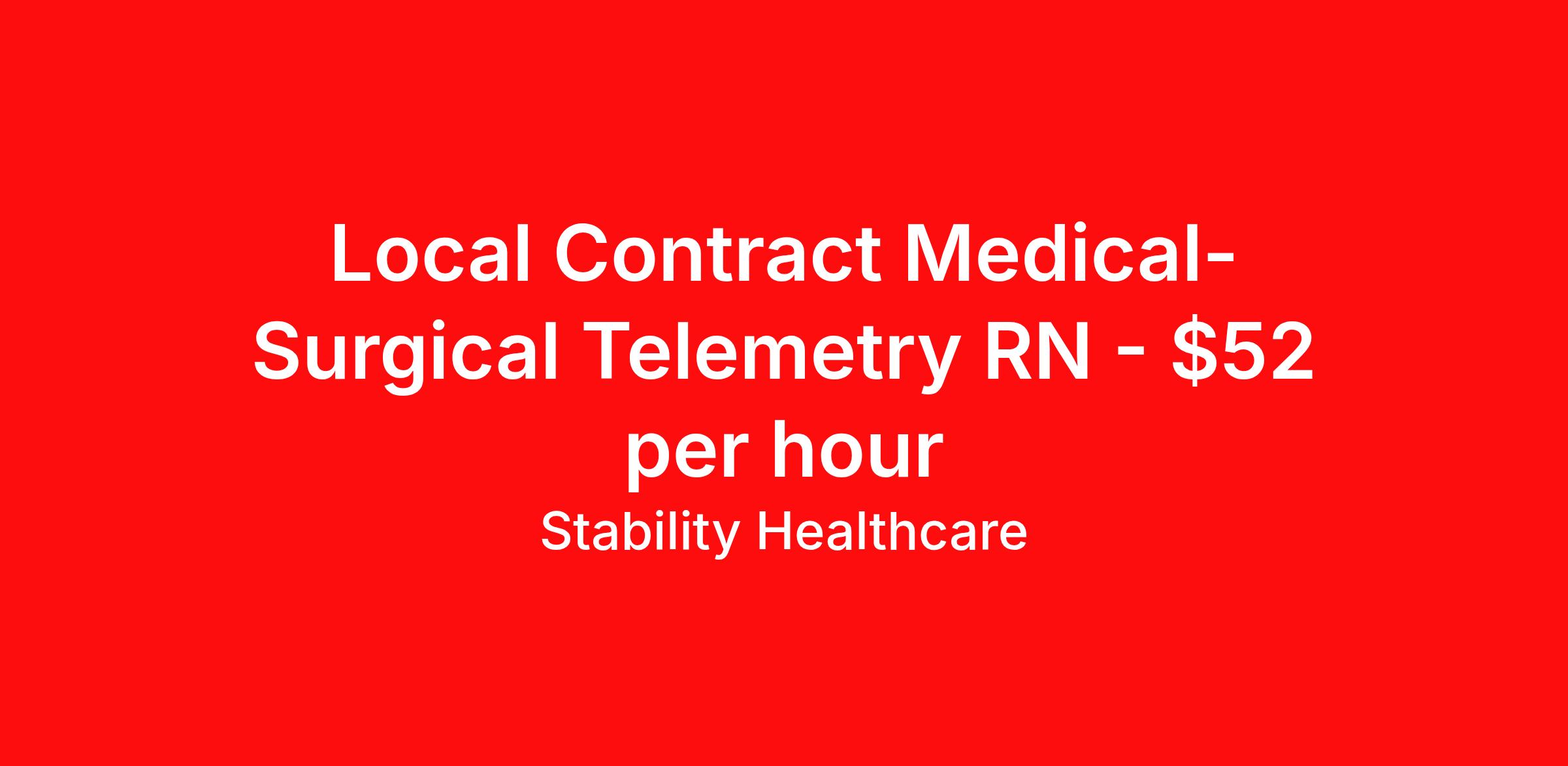 Stability Healthcare is seeking a local contract nurse RN Med Surg / Telemetry for a local contract nursing job in Des Moines, Iowa. Job Description & Requirements Specialty: Med Surg / Telemetry Discipline: RN Duration: 13 weeks 36 hours per week Shift: 12 hours, nights Employment Type: Local Contract Stability Healthcare is looking for a Med-Surg RN contract position in Des Moines, IA. The majority of hospitalized patients are admitted to M/S either directly or after surgery. M/S is also where patients who have been in critical care (ICU) are transferred when they no longer need critical care but still require nursing care. *$600 travel bonus *Day 1 health insurance with United Healthcare *PTO plan start accruing on day 1, use during contract or cash out at the end! *Guaranteed stipend if facility calls you off *Extra hour bonus earn an additional hourly bonus for working over your weekly contracted hours Stability Job ID L-804225. Pay package is based on 12 hour shifts and 36 hours per week (subject to confirmation) with tax-free stipend amount to be determined. Posted job title: Med-Surg About Stability Healthcare Stability Healthcare was founded in 2009, with the mission of becoming the best Travel Nursing Agency in California. We have been rated one of the top travel nursing agencies and offer our nurses the highest paying travel nursing jobs available. We have access to the best travel assignments from 1000’s of facilities. You can start the year off in sunny California, spend the Spring in the Colorado Rockies, enjoy the Summer in the Mid-West, experience the change of seasons in Boston and New York, and hit the beaches of Florida in the winter. Our Nurses work in the best hospitals and health systems in the country. Benefits Guaranteed Hours Benefits start day 1