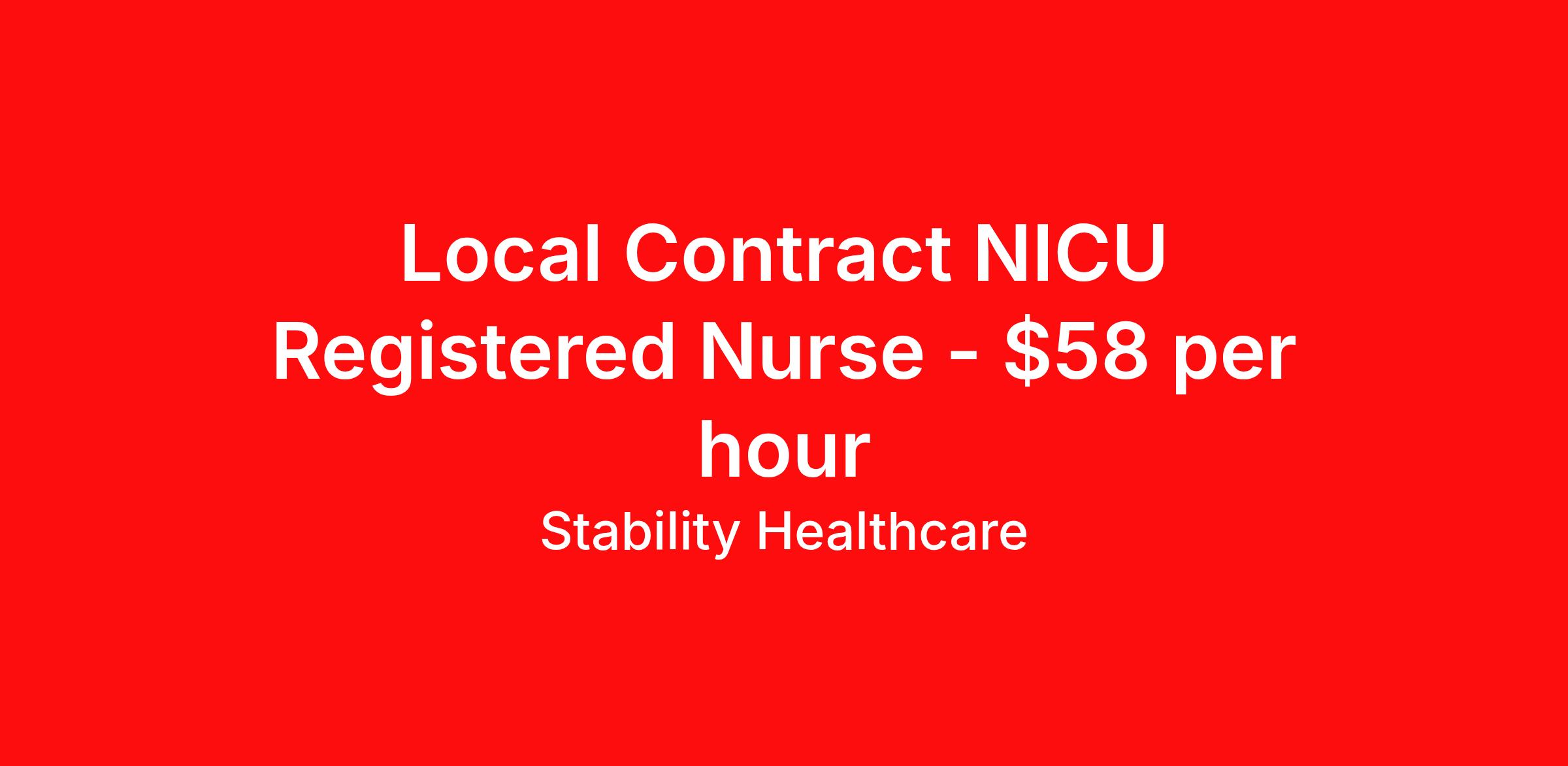 Stability Healthcare is seeking a local contract nurse RN NICU - Neonatal Intensive Care for a local contract nursing job in San Luis Obispo, California. Job Description & Requirements Specialty: NICU - Neonatal Intensive Care Discipline: RN Duration: 13 weeks 36 hours per week Shift: 12 hours Employment Type: Local Contract Stability Healthcare is looking for a NICU RN contract position in San Luis Obispo, CA. NICU nurses provide care for newborns needing close monitoring due to premature birth, defects, infection, or other medical conditions requiring surgery or therapy. As a Neonatal Intensive Care Nurse, you'll work under the direction of a physician, caring for the newborn, and helping to educate parents. *$600 travel bonus *Day 1 health insurance with United Healthcare *PTO plan start accruing on day 1, use during contract or cash out at the end! *Guaranteed stipend if facility calls you off *Extra hour bonus earn an additional hourly bonus for working over your weekly contracted hours Stability Job ID L-823698. Pay package is based on 12 hour shifts and 36 hours per week (subject to confirmation) with tax-free stipend amount to be determined. Posted job title: NICU About Stability Healthcare Stability Healthcare was founded in 2009, with the mission of becoming the best Travel Nursing Agency in California. We have been rated one of the top travel nursing agencies and offer our nurses the highest paying travel nursing jobs available. We have access to the best travel assignments from 1000’s of facilities. You can start the year off in sunny California, spend the Spring in the Colorado Rockies, enjoy the Summer in the Mid-West, experience the change of seasons in Boston and New York, and hit the beaches of Florida in the winter. Our Nurses work in the best hospitals and health systems in the country. Benefits Guaranteed Hours Benefits start day 1