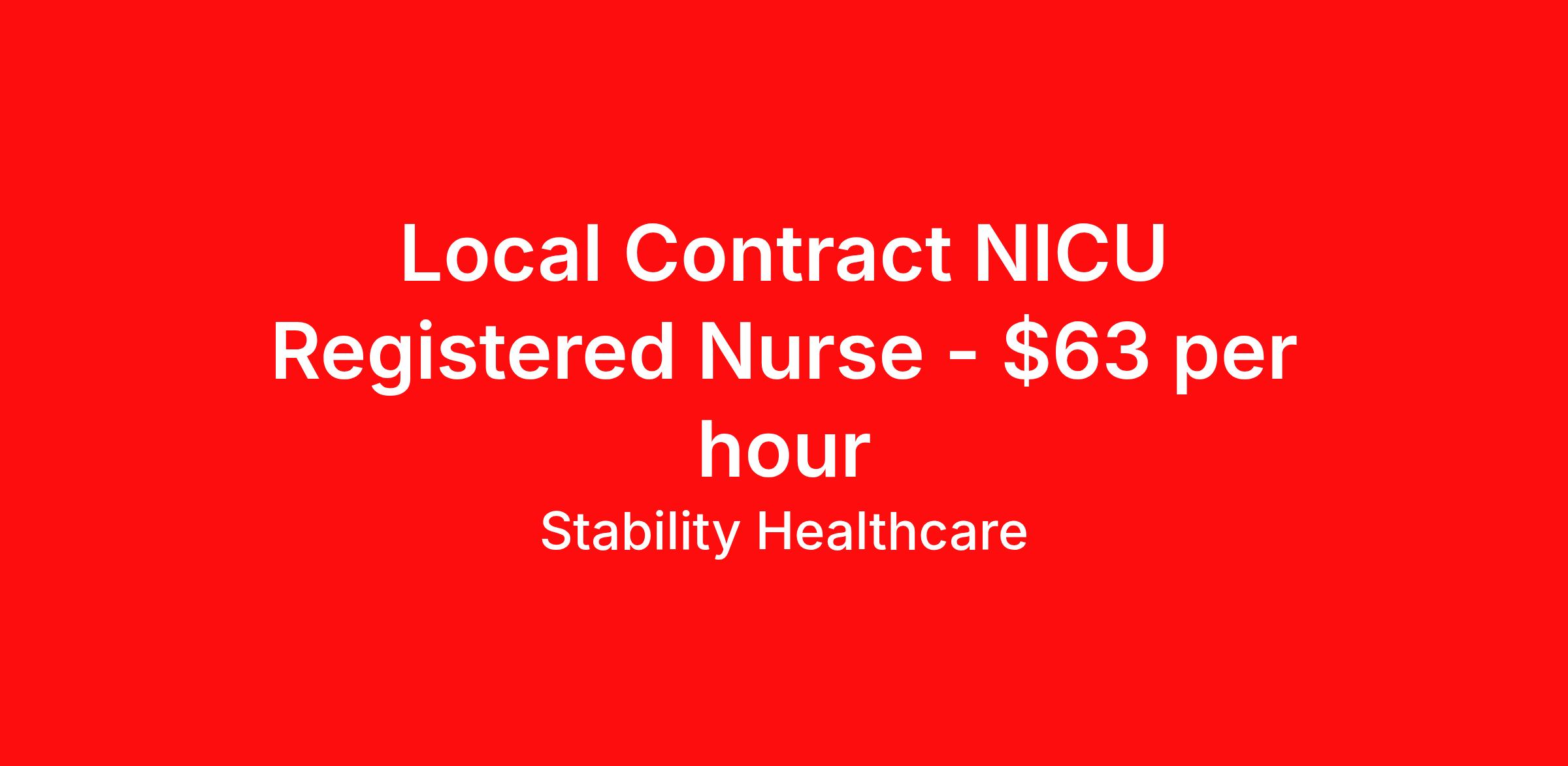Stability Healthcare is seeking a local contract nurse RN NICU - Neonatal Intensive Care for a local contract nursing job in Salinas, California. Job Description & Requirements Specialty: NICU - Neonatal Intensive Care Discipline: RN Duration: 8 weeks 36 hours per week Shift: 12 hours, nights Employment Type: Local Contract Stability Healthcare is looking for a NICU RN contract position in Salinas, CA. NICU nurses provide care for newborns needing close monitoring due to premature birth, defects, infection, or other medical conditions requiring surgery or therapy. As a Neonatal Intensive Care Nurse, you'll work under the direction of a physician, caring for the newborn, and helping to educate parents. *$600 travel bonus *Day 1 health insurance with United Healthcare *PTO plan start accruing on day 1, use during contract or cash out at the end! *Guaranteed stipend if facility calls you off *Extra hour bonus earn an additional hourly bonus for working over your weekly contracted hours Stability Job ID L-826116. Pay package is based on 12 hour shifts and 36 hours per week (subject to confirmation) with tax-free stipend amount to be determined. Posted job title: NICU About Stability Healthcare Stability Healthcare was founded in 2009, with the mission of becoming the best Travel Nursing Agency in California. We have been rated one of the top travel nursing agencies and offer our nurses the highest paying travel nursing jobs available. We have access to the best travel assignments from 1000’s of facilities. You can start the year off in sunny California, spend the Spring in the Colorado Rockies, enjoy the Summer in the Mid-West, experience the change of seasons in Boston and New York, and hit the beaches of Florida in the winter. Our Nurses work in the best hospitals and health systems in the country. Benefits Guaranteed Hours Benefits start day 1